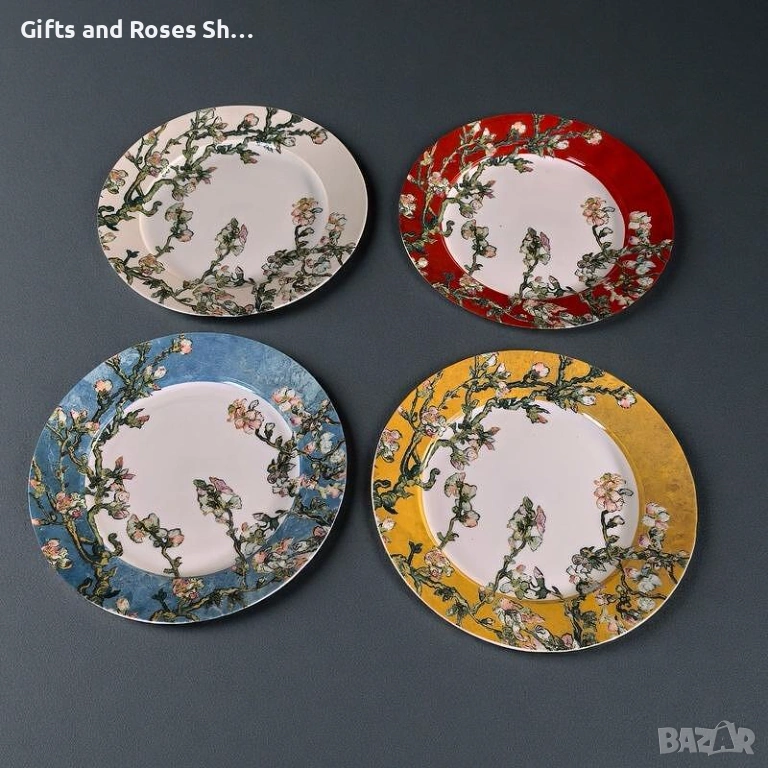 Комплект от 4 десертни порцеланови чинии с Бадемов цвят, 19 см - вдъхновени от творчеството на Ван Гог.
