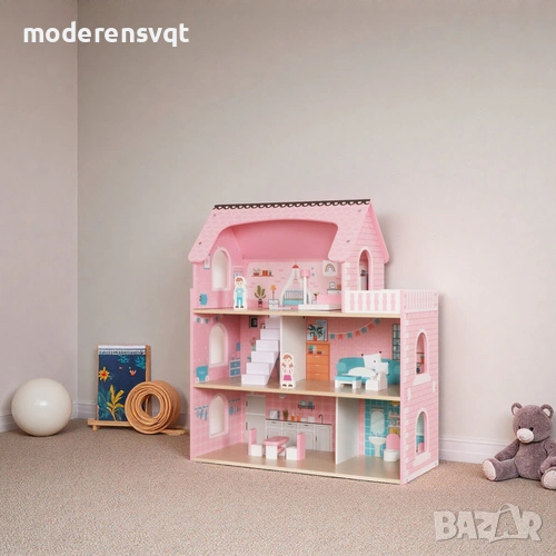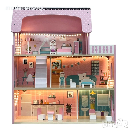 Голяма дървена къщичка за кукли, LED осветление + мебели и аксесоари, 3 нива – мечтата на всяко момиче!