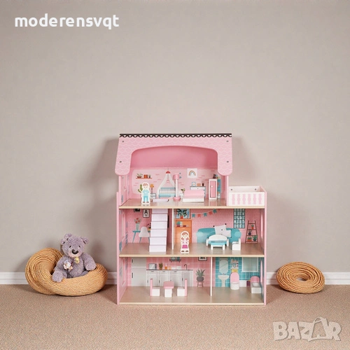 Издръжливост - къщичката за кукли и всички дървени елементи са изключително издръжливи и устойчиви на интензивна игра, благодарение на здравата конструкция те ще издържат много часове творческа игра