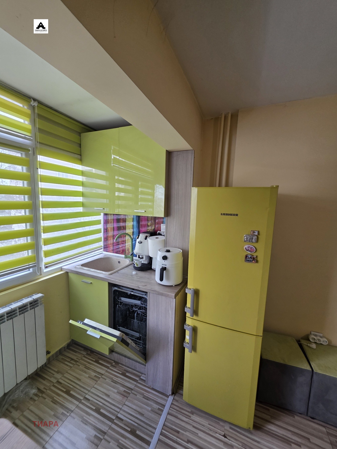 - Светла всекидневна с кухненски бокс и трапезна част, оборудвана с вградени електроуреди на Gorenje;