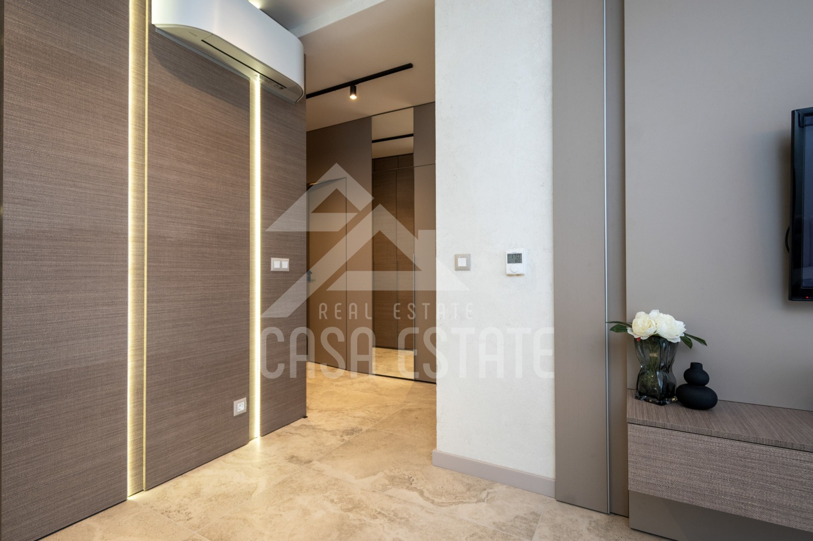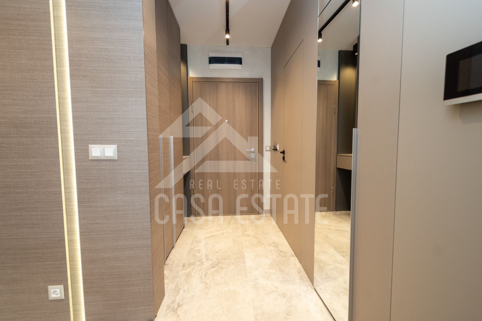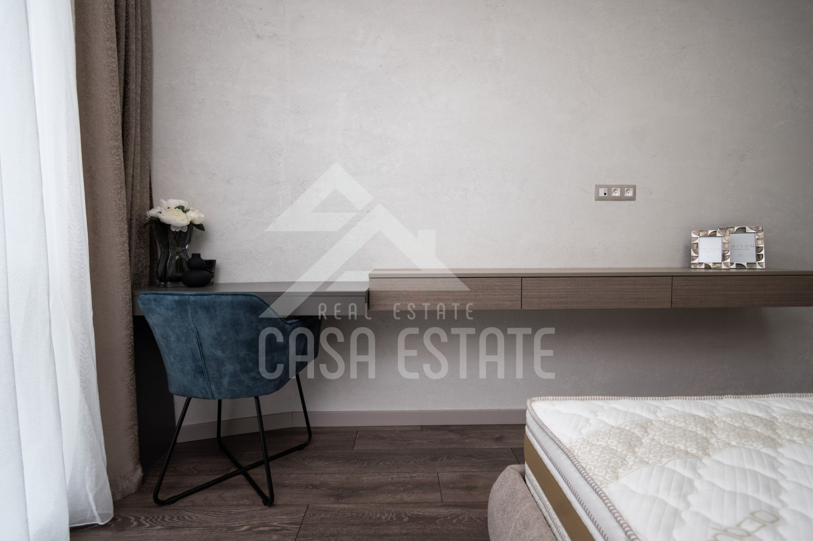 Жилището е завършено и обзаведено по индивидуален дизайнерски проект.Състои се от просторен дневен тракт с мека мебел, трапезна част с вградена кухня с всички необходими уреди за едно домакинство. Спалня, баня и мокро помещение. Тераса с гледка към вътрешния двор на комплекса. Отоплението е на газ, има и поставени климатици във всяко едно помещение за допълнителен комфорт.
