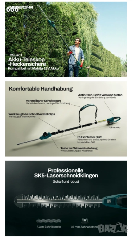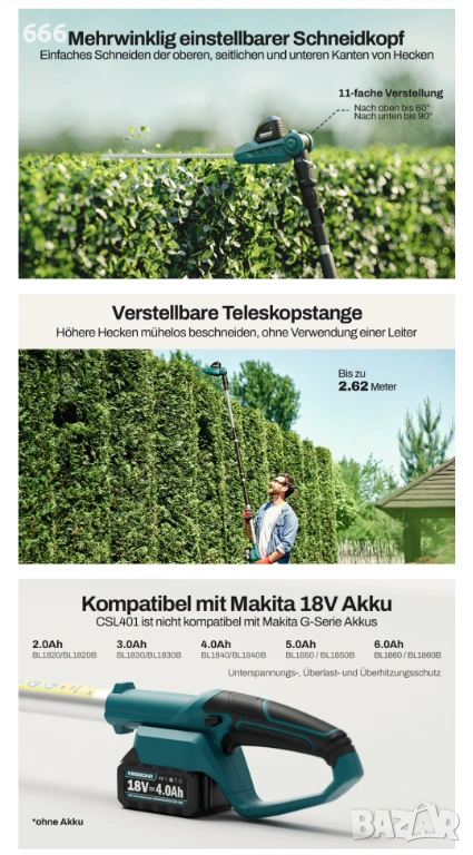 CSL401 Безжична телескопична ножица за жив плет, съвместима с батерии Makita 18 V, ширина на рязане 41 см, разстояние между зъбците 16 мм, височина до 262 см, 11-посочна регулируема режеща глава.