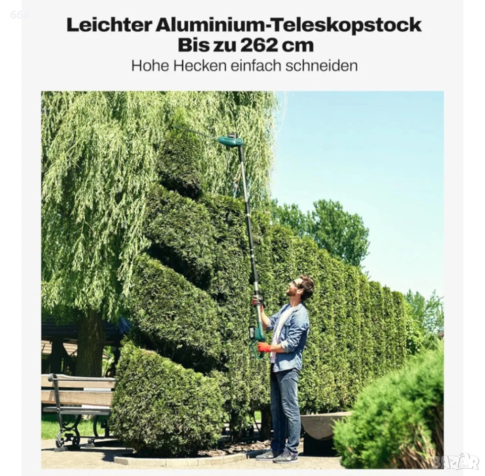 Напълно регулируема телескопична щанга: гъвкавото регулиране на височината на телескопичната щанга до 262 см с механизъм за заключване позволява лесно рязане на високи и ниски живи плетове и храсти.