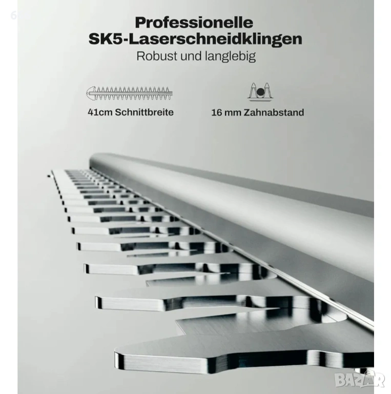 ИЗДРЪЖЛИВИ НОЖОВЕ С ПРОФЕСИОНАЛНО КАЧЕСТВО Ножовете на разтегателните ножици за жив плет са изработени от висококачествена стомана SK5 с лазерно рязане, остри и издръжливи. Дизайнът с двойно острие с ширина на рязане 41 см и разстояние между зъбите 16 мм осигурява чисто рязане на живия плет.