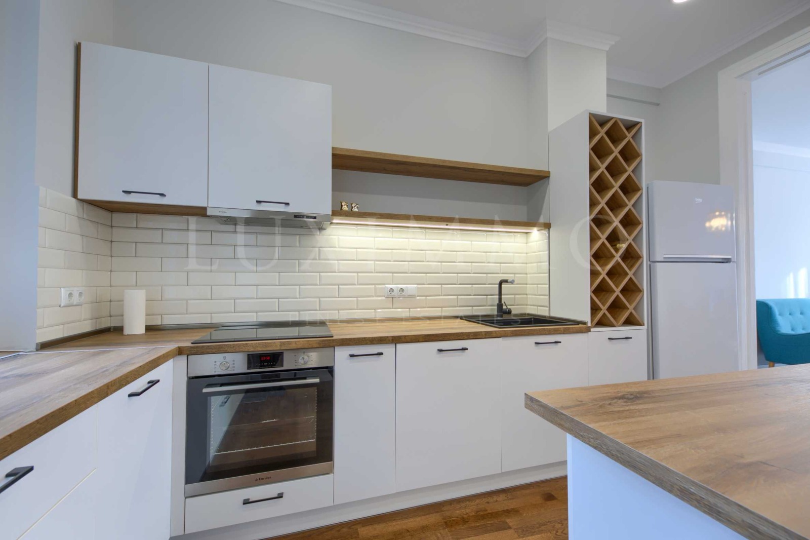 Жилището заема 2-ри етаж в сграда на 6 етажа. Изложението е юг/север. Изцяло ремонтирано е, и е довършено с висококачествени довършителни материали, както следва: