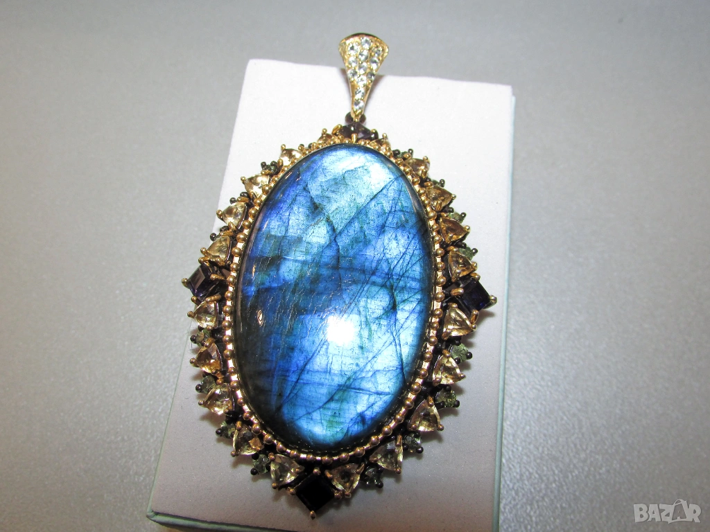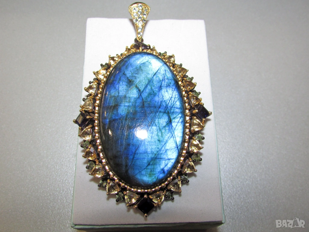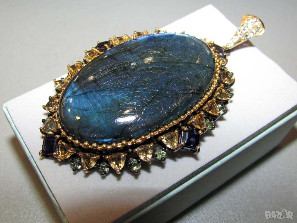 925 сребърно колие с родиево и златно покритие и голям син лабрадорит 70 карата, размери 76x45x9. Тегло 34гр. Другите камъни са цитрин, йолит и перидот. Проиход Африка. Цена 145е., 282лв.