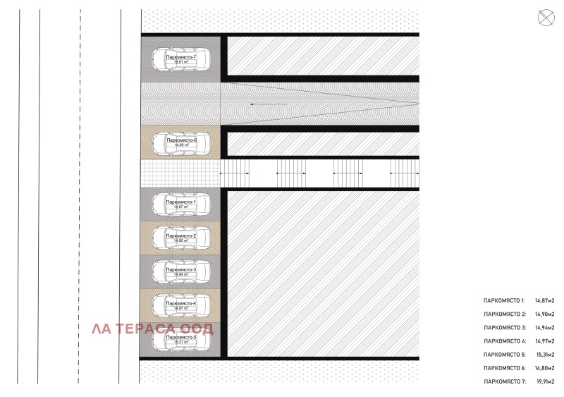 В сградата има 5 единични и 2 двойни подземни гаражи с площ от 32 до 42 кв.м., както и 6 външни покрити парко места. Първата спирка на асансьора е на нивото на гаражите. Апартаментът разполага с голям дрешник.