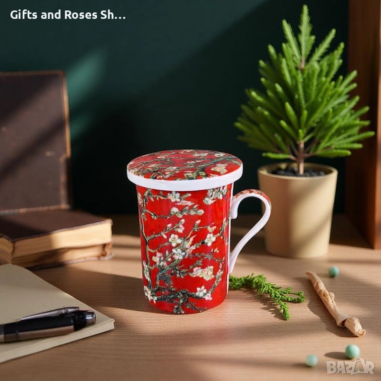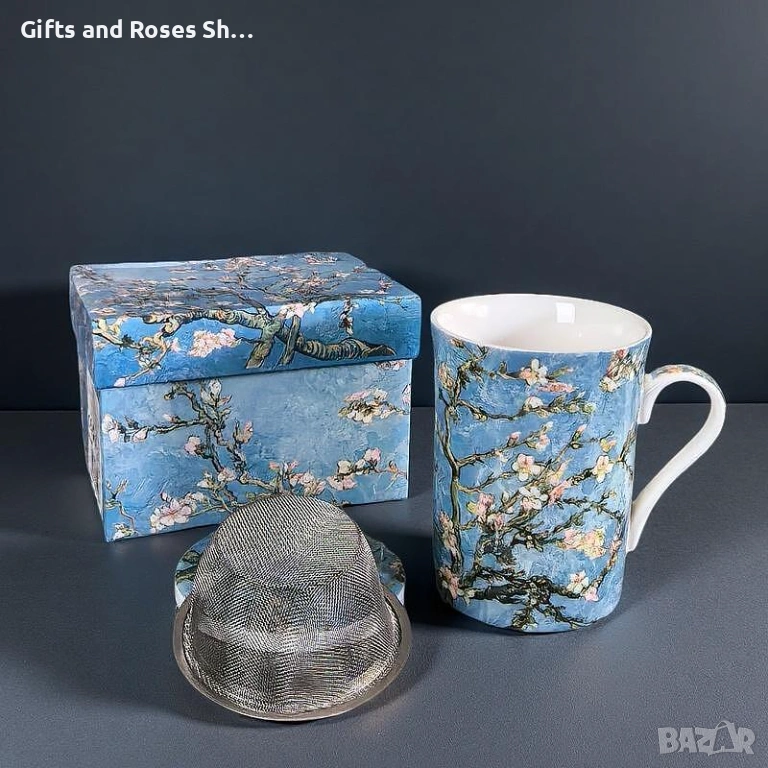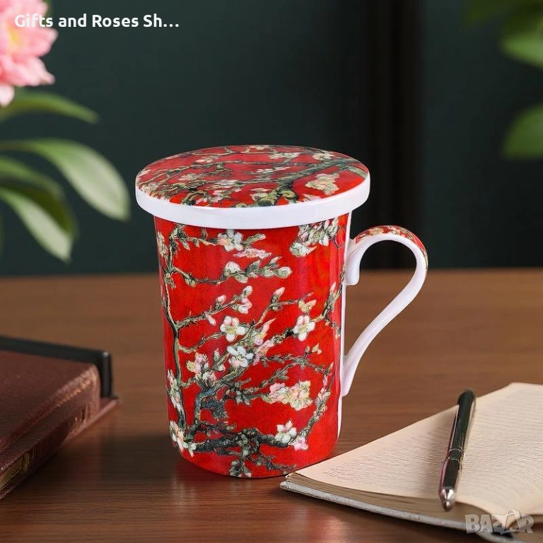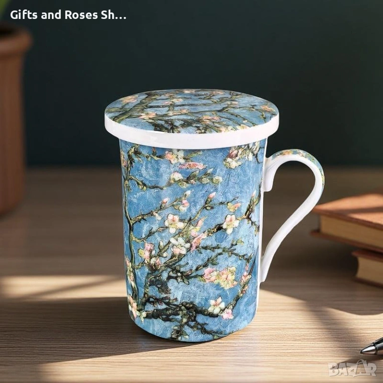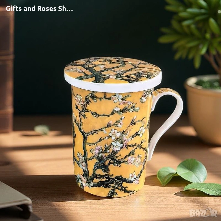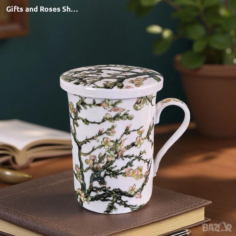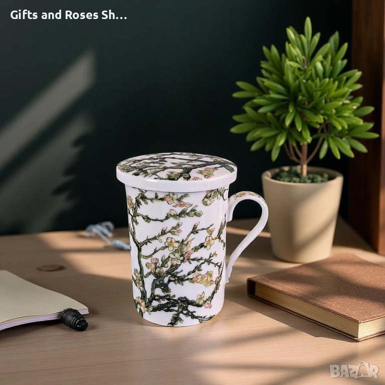 Порцеланова чаша за чай с капаче и цедка Бадемов цвят → Обява 53498751