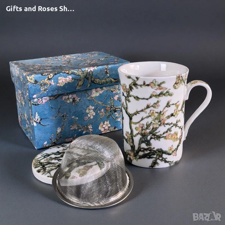 Порцеланова чаша за чай с капаче и цедка , 270 мл - Бадемов цвят, в подаръчна кутия.