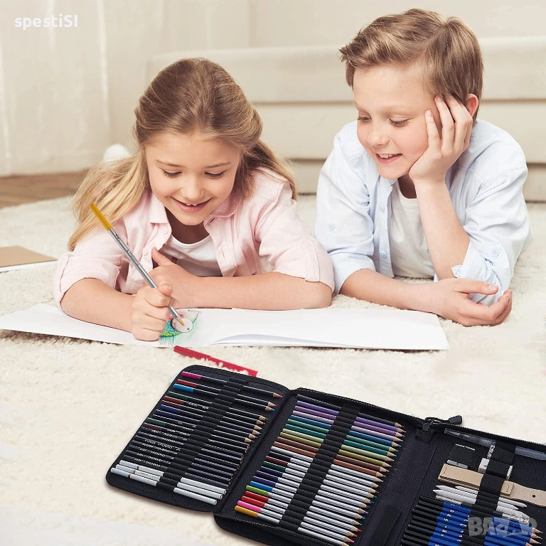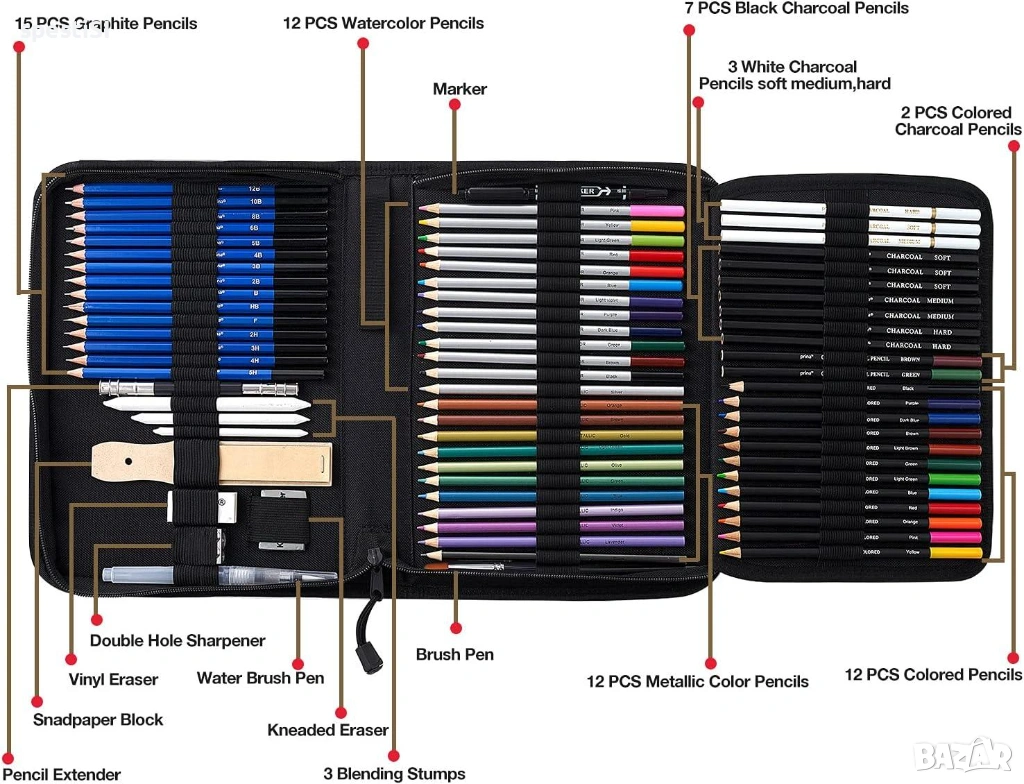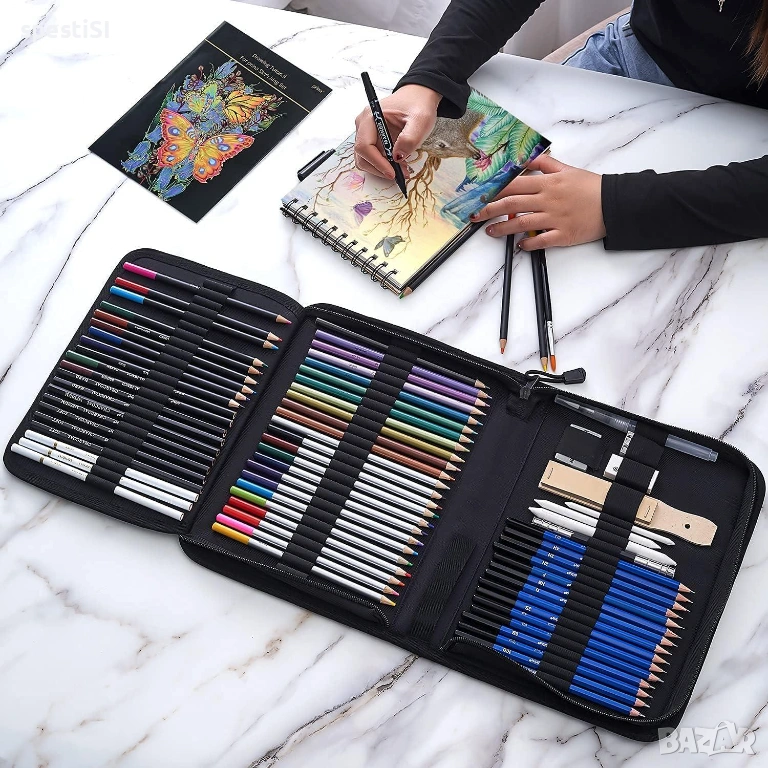 Всички инструменти са организирани в текстилен калъф с цип, който държи моливите подредени и защитени от счупване. Скицникът със спирала включва три цвята хартия, което позволява работа както с тъмни, така и със светли моливи за постигане на различни визуални ефекти. Комплектът е подходящ за използване у дома, в училище или по време на пътуване.