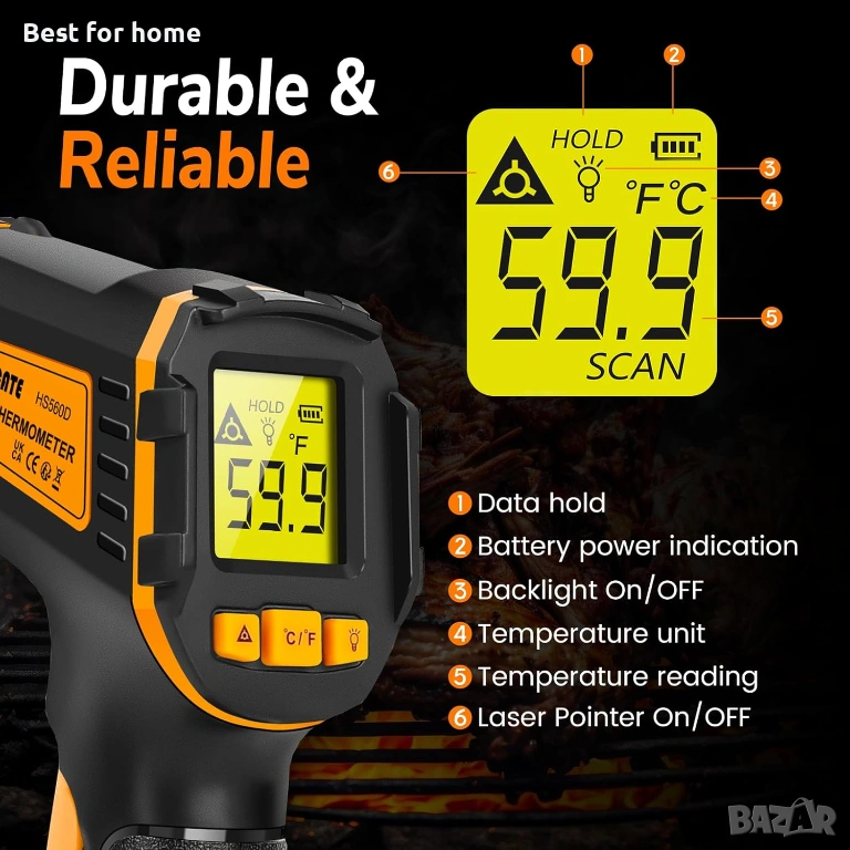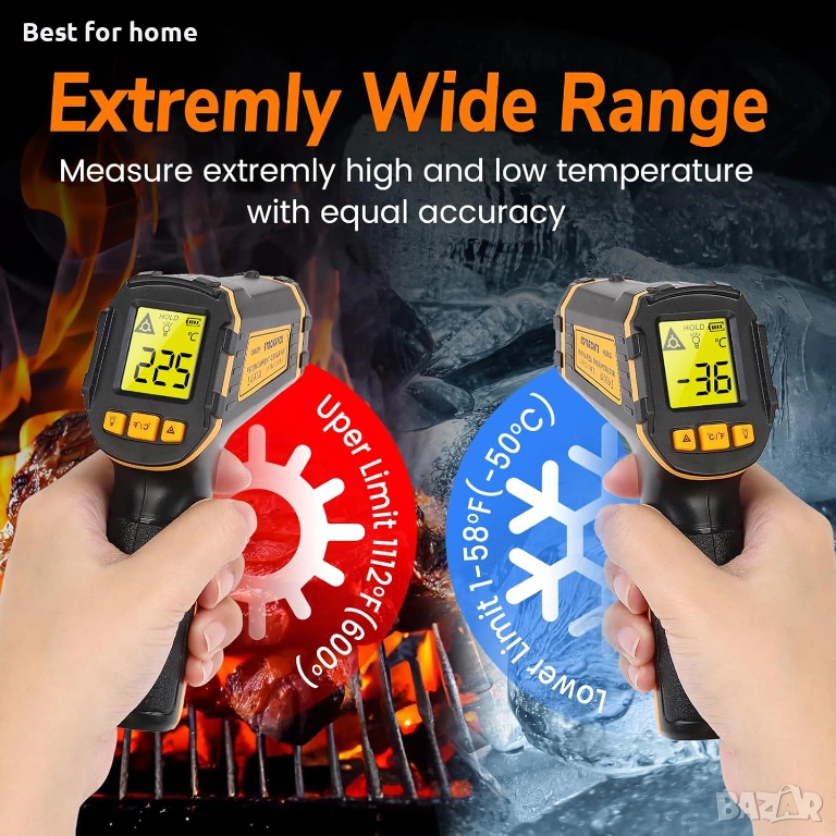 【ИЗДРЪЖЛИВ И НАДЕЖДЕН】Инфрачервен термометър за храна, изработен от висококачествени материали, този термометър е създаден да издържа на различни среди, осигурявайки дългосрочна точност и надеждност за постоянни измервания на температурата. Той е важен инструмент за различни приложения, включително готвене, барбекю, ремонт на автомобили и други, най-добрият подарък за вашето семейство.