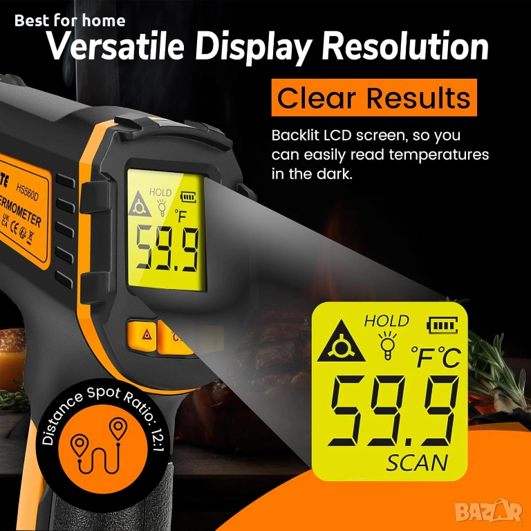 【ИЗМЕРВАНЕ НА ТЕМПЕРАТУРИ БЕЗОПАСНО】Инфрачервен термометър за месо, създаден за безопасност, този безконтактен термометър позволява измерване на температурата от разстояние, идеален за опасни или труднодостъпни зони. Инфрачервен термометър за месо. Перфектен за промишлена или битова употреба, гарантиращ безопасност без компромис с точността.