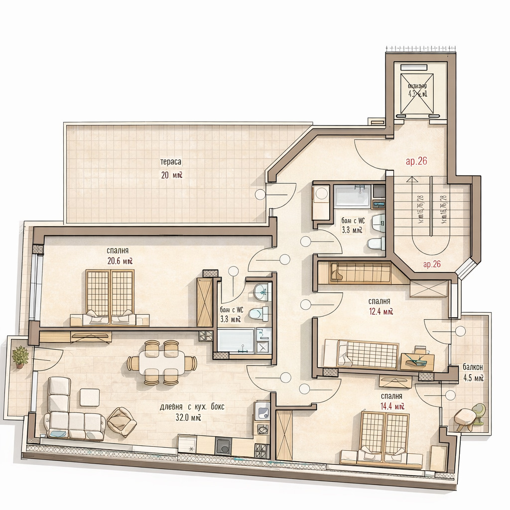 Дневен тракт, три спални, коридор, две бани с тоалетна, килер и три тераси + 100 КВ.М ПАНОРАМНА ПОКРИВНА ТЕРАСА.