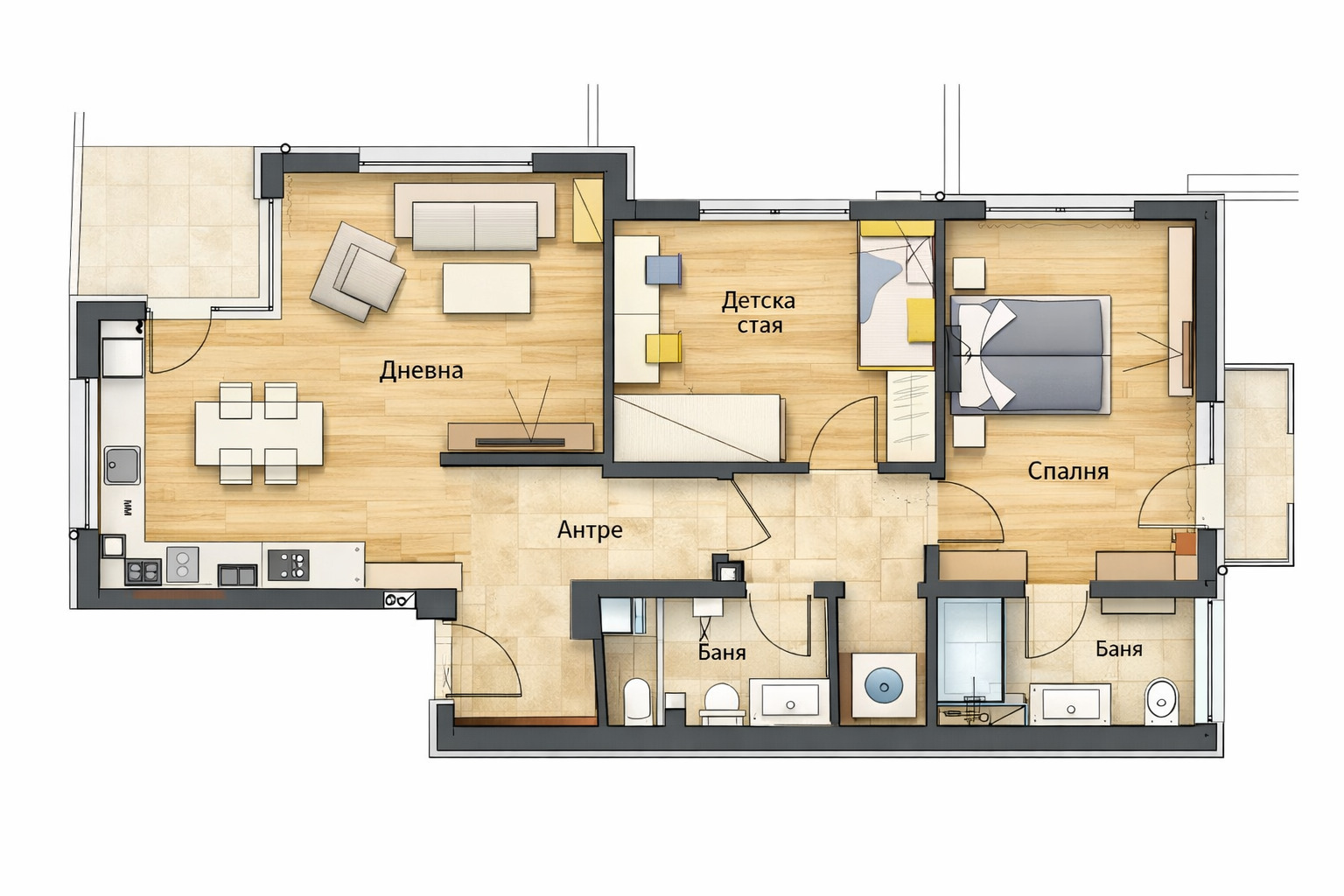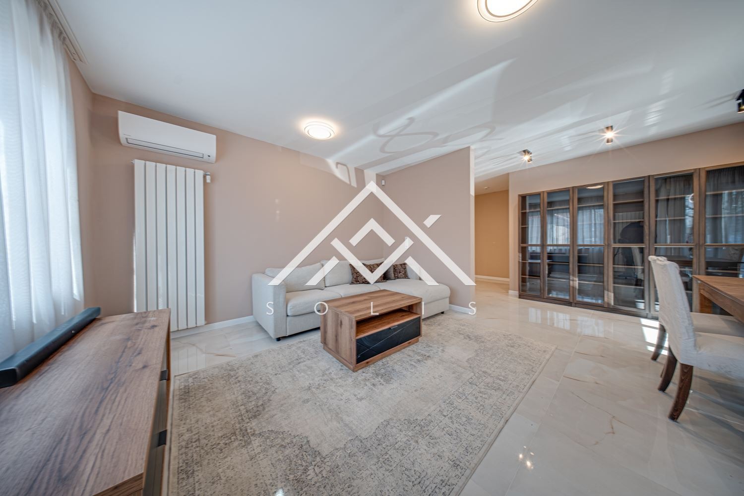 Разположен е на първи етаж и разполага със застроена площ около 110 кв.м, тераси около 33 кв.м и собствен двор с градина около 45 кв.м. Дневната е организирана като общо пространство с кухня и трапезария и има излаз към голяма ъглова тераса. Коридорът води към двете спални. Основната спалня е със собствена баня и директен изход към двора, налична е втора баня и отделно сервизно помещение за пералня и сушилня.