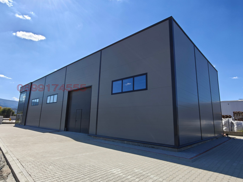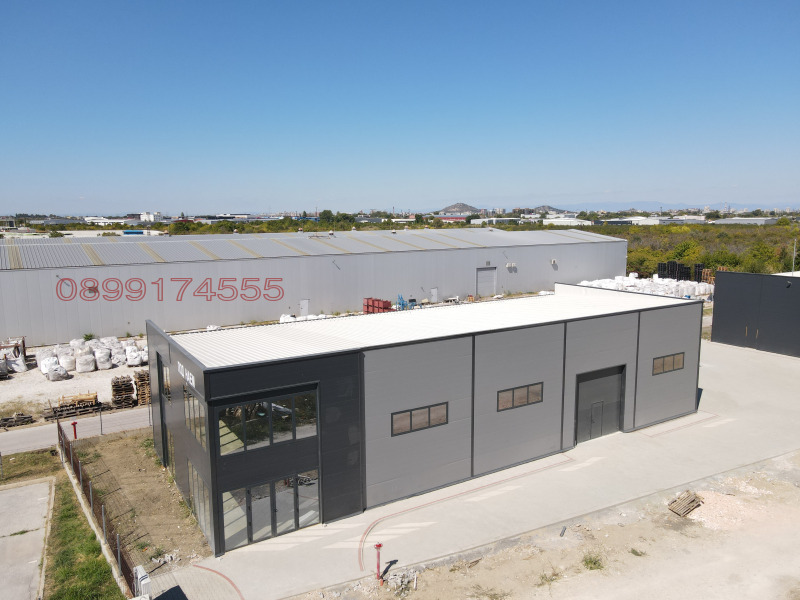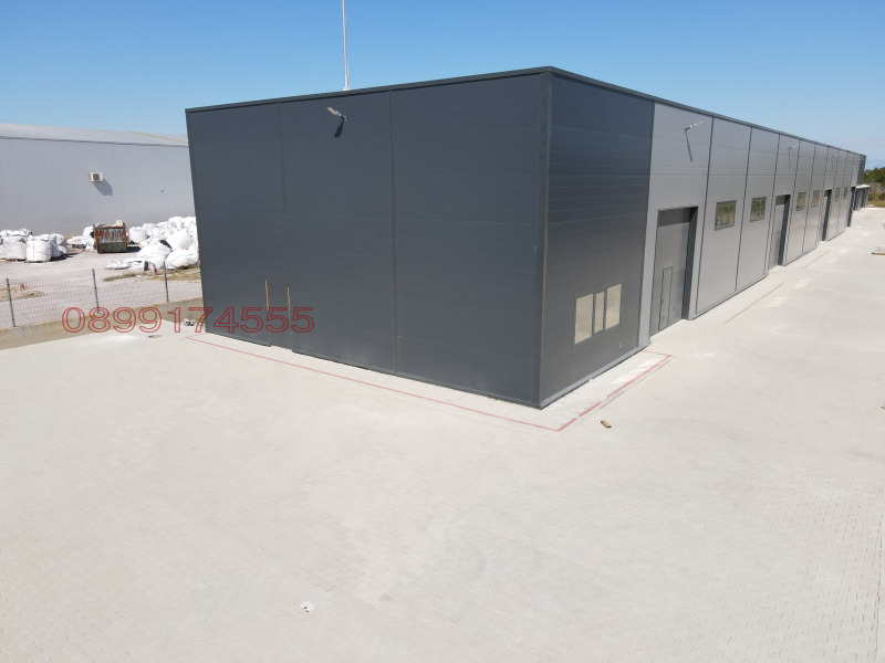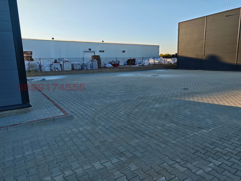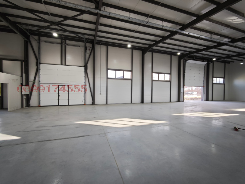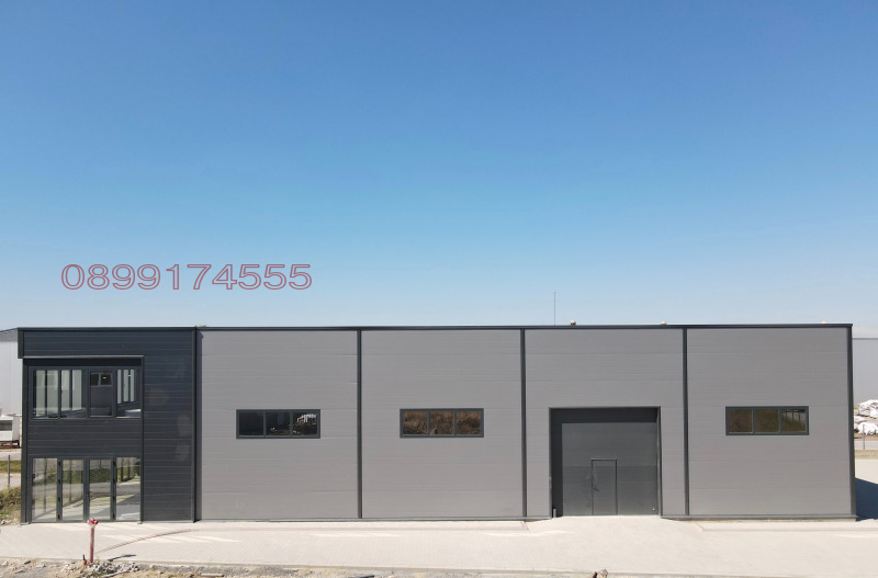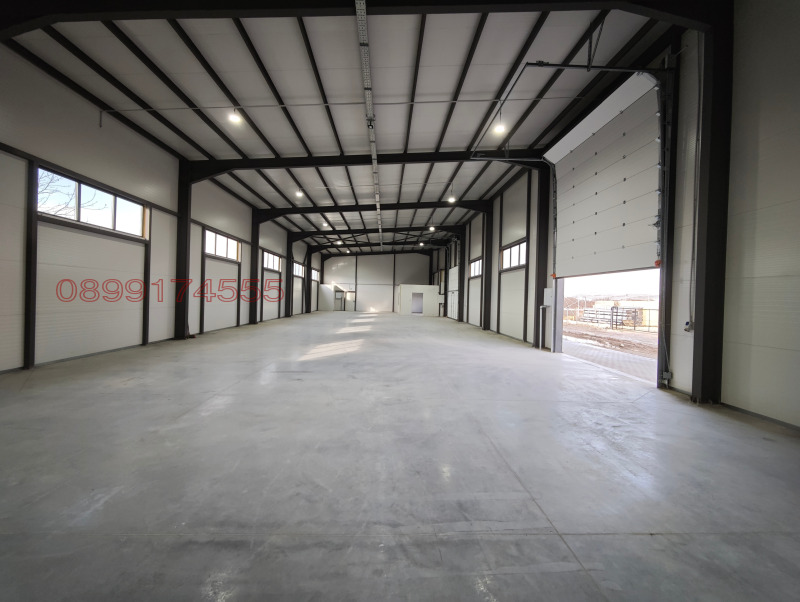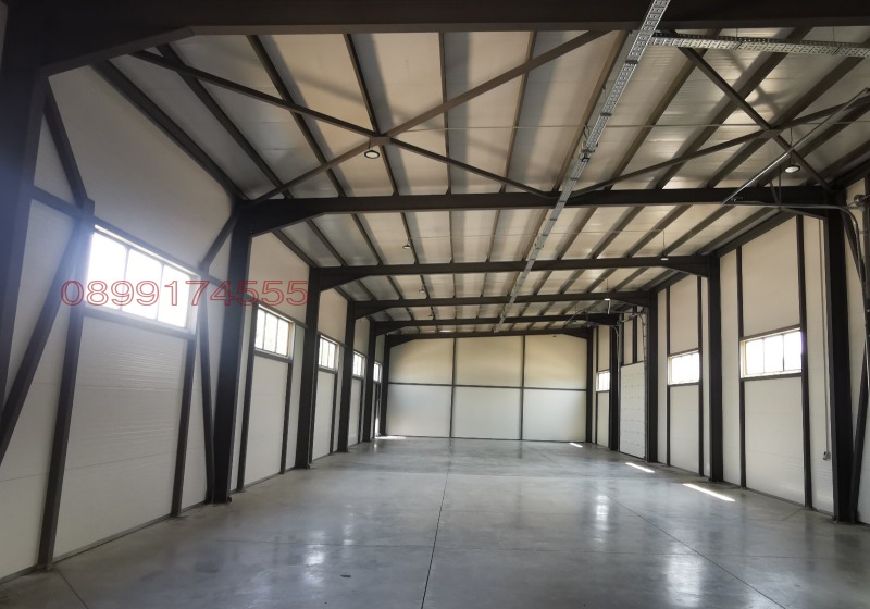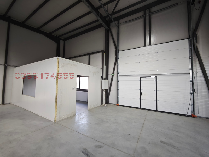 300 кв.м. складова площ. Настилка - шлайфан бетон, 1 бр. секционна врата 4м х 4м. Паркинг - плац 500кв.м. Метална конструкция с 10 см. Термо панел. Височина 6-7 метра.