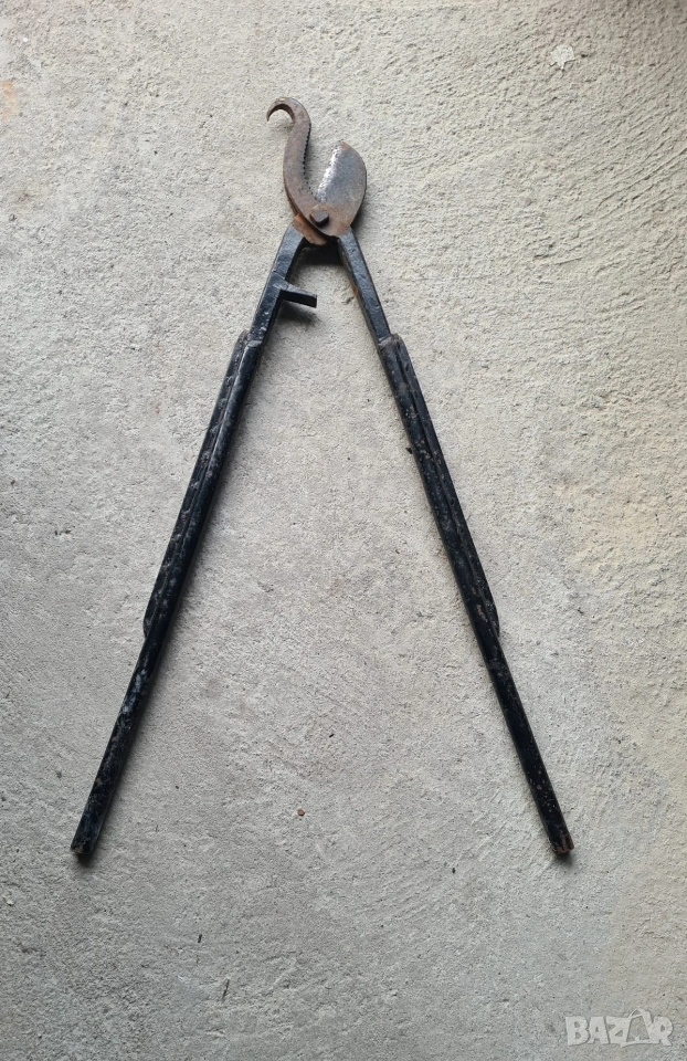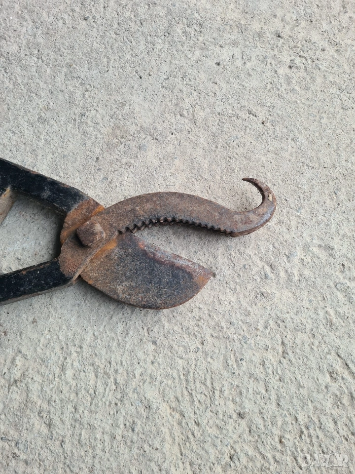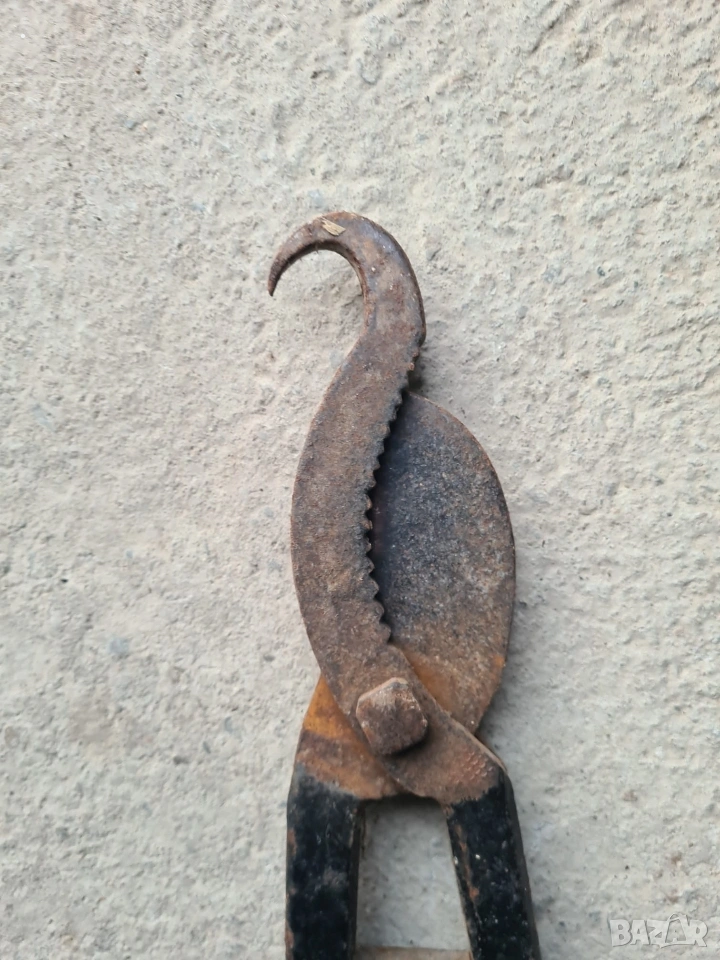 Продавам автентична старинна ветеринарна медицинска ножица, използвана в миналото основно за скопяване (кастрация) на животни. Инструментът е изработен от масивна кована стомана и се отличава със специфичен дизайн с назъбена челюст и кука за фиксиране