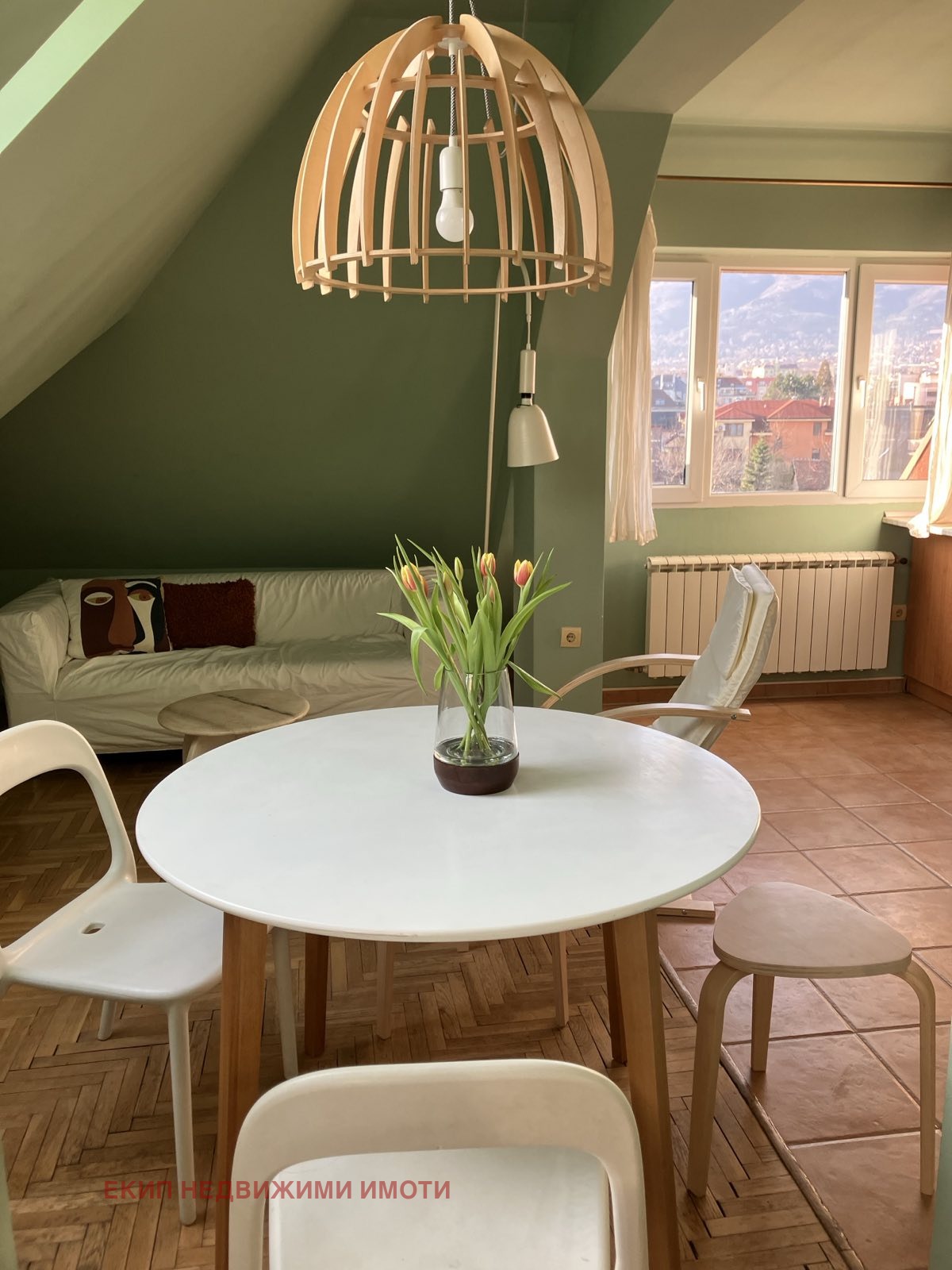 Хубав, слънчев, просторен апартамент, тип студио, обзаведен, кухнята е оборудвана с всички необходими ел.уреди, трапезна маса със столове, диван, артистично вградени секционни шкафове, разчупена визия на мебелите. Дограми ПВЦ, подови настилки теракот и естествен паркет, баня на теракот и фаянс, климатик за отопление и охлаждане. Прекрасна панорама към Витоша, изложение юг/изток.