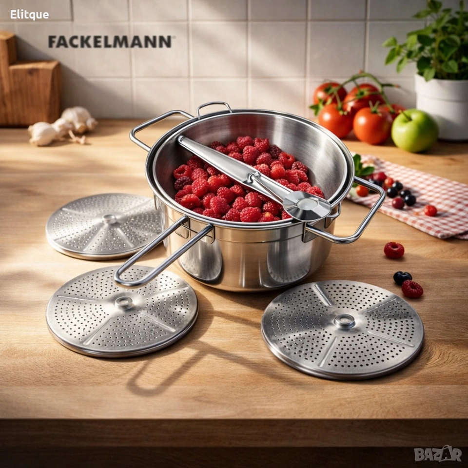 Материал: Неръждаема стомана за устойчивост на корозия и лесна хигиена.Диаметър: 19 см.Височина: 8 см.Ширина: 33 см.Дълбочина: 8 см.Комплект: 4 части, включващи купа, дръжка/лост и три различни сито-диска (фино, средно, по-едро). Точните размери и пробиви на дисковете са подбрани за балансиран поток и оптимално отделяне на семки и обелки. Подходяща за домашна и полупрофесионална употреба, лесна за почистване — препоръчва се пране ръчно или в горния съд на миялна машина в зависимост от упътванията.