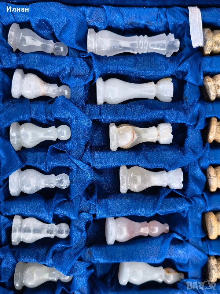 шахов комплект от естествен оникс, в луксозна кутия с кадифе – идеален както за колекция, така и за игра.