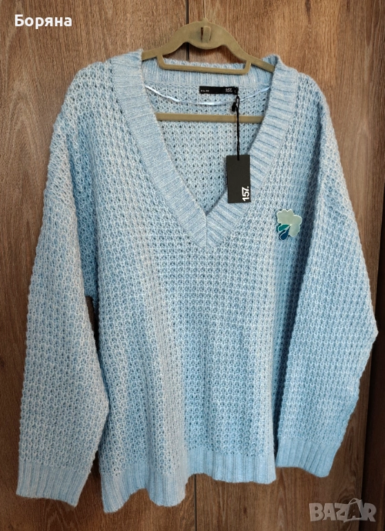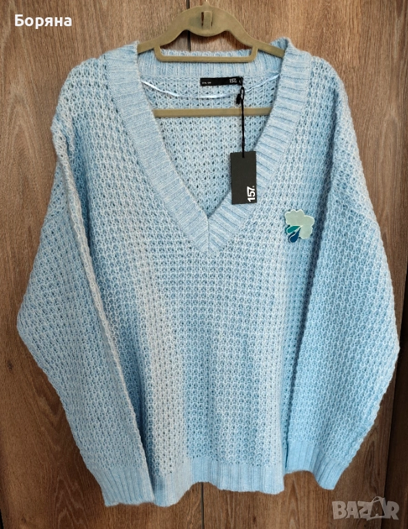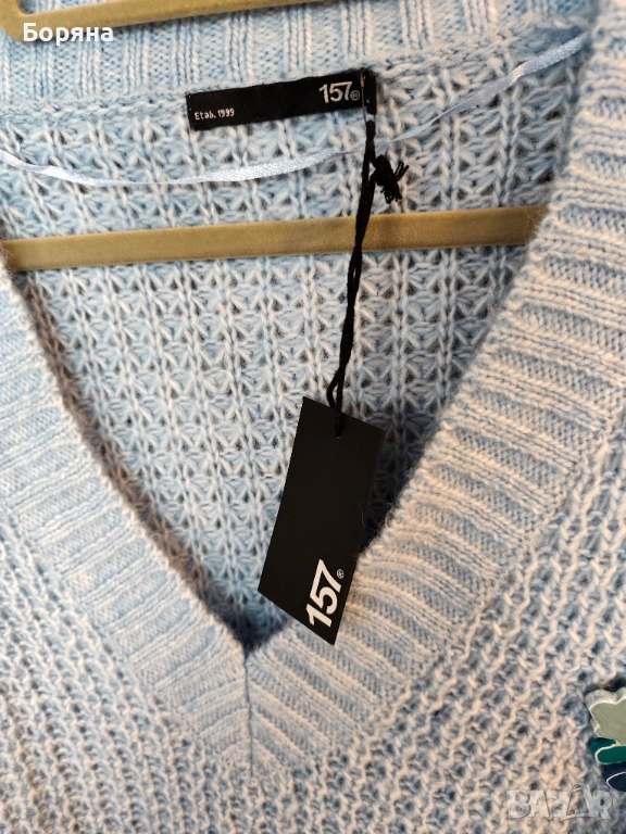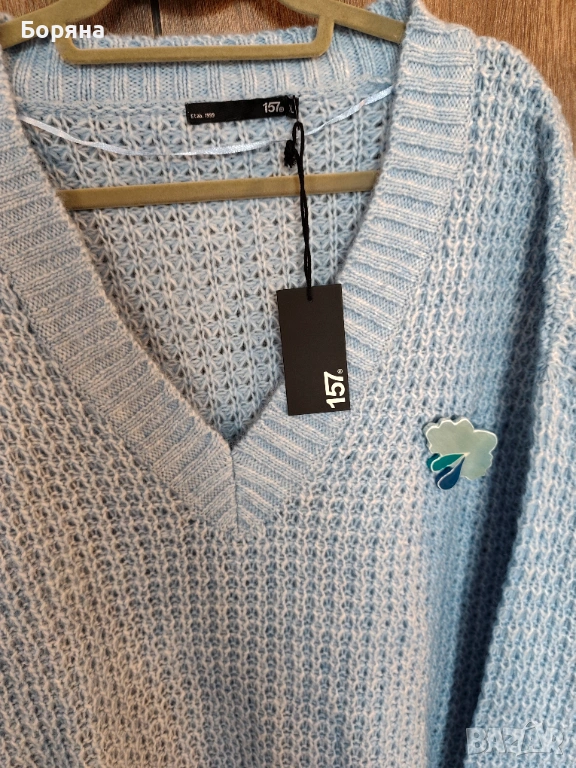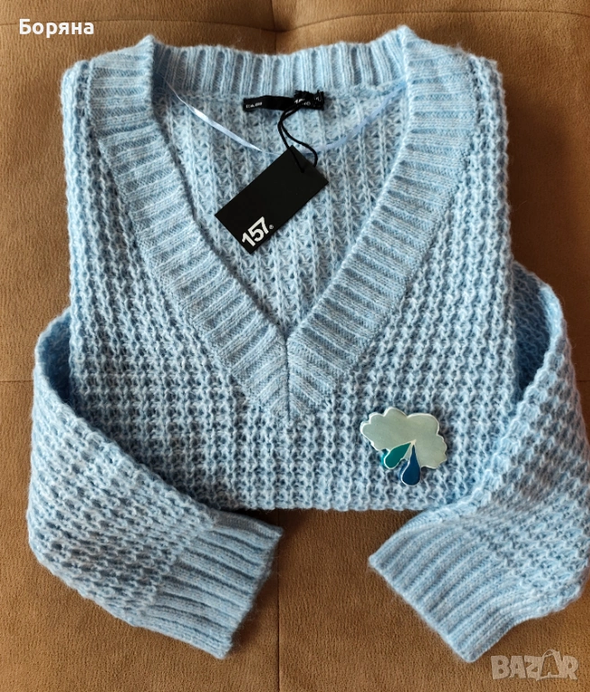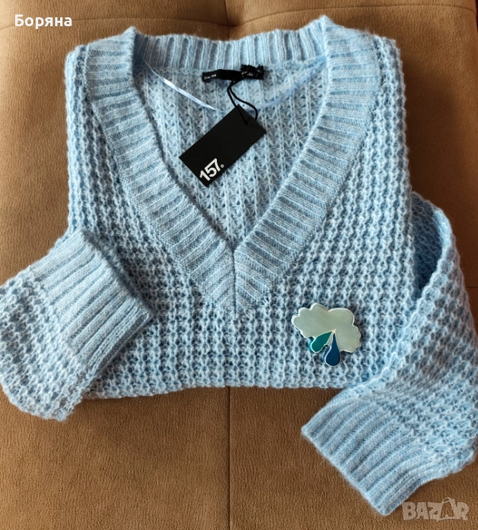Нов син пуловер бранд 157 LEGER с брошка облак дъжд → Обява 53501596