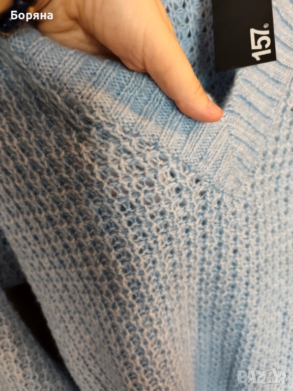 Прекрасен син пуловер на шведския бранд 157, нов с етикет, рехава плетка с остро деколте.