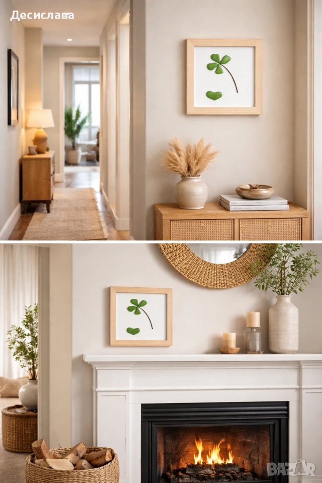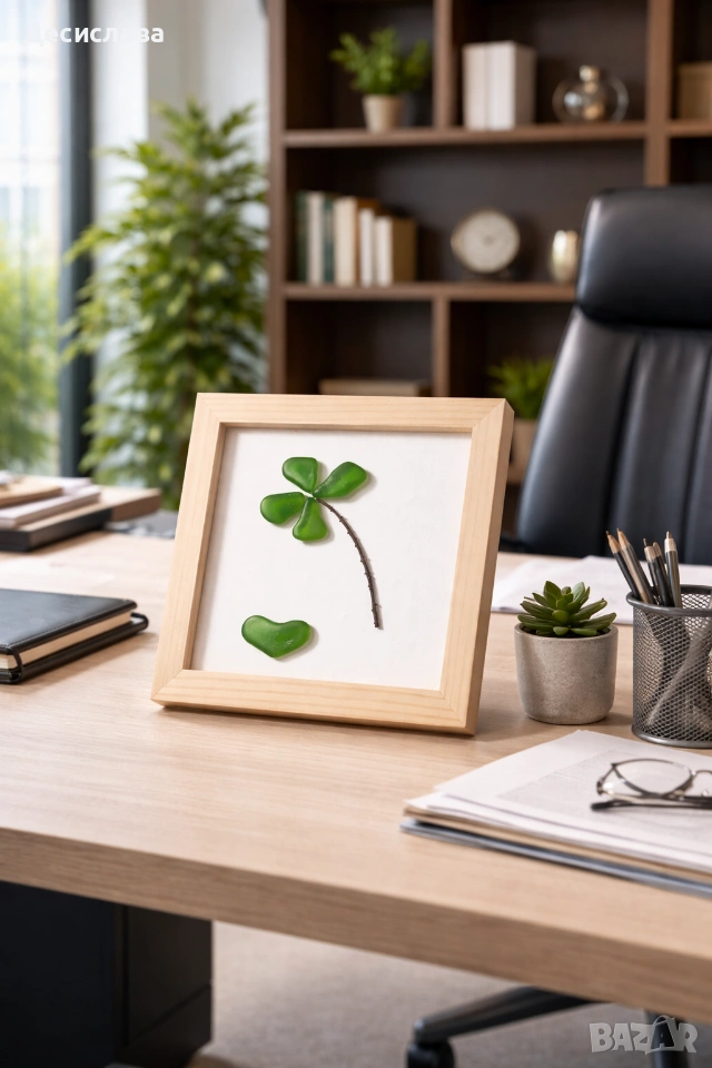„Тази уникална картина е изработена ръчно от естествено морско стъкло, събрано от българския плаж. Всяко парче стъкло е обработено с внимание и любов, за да се превърне в четирилистна детелина – символ на късмет и позитивна енергия.