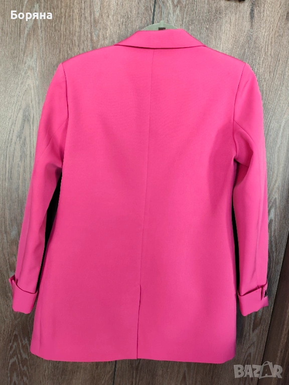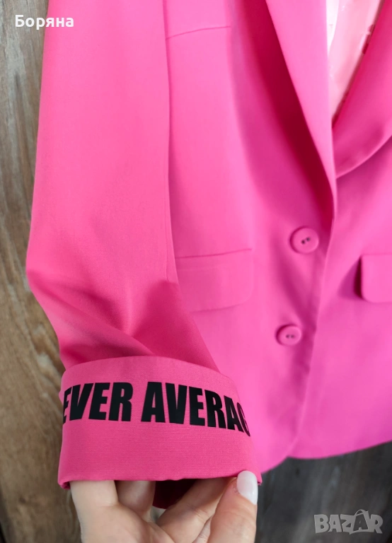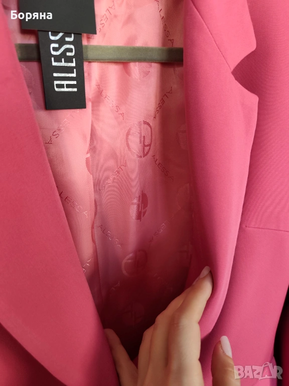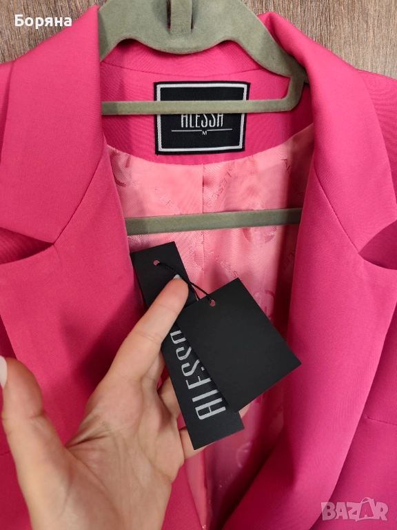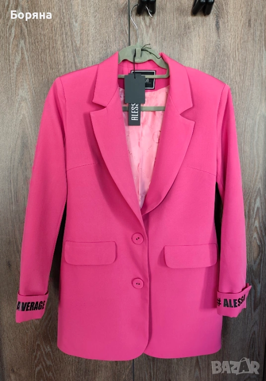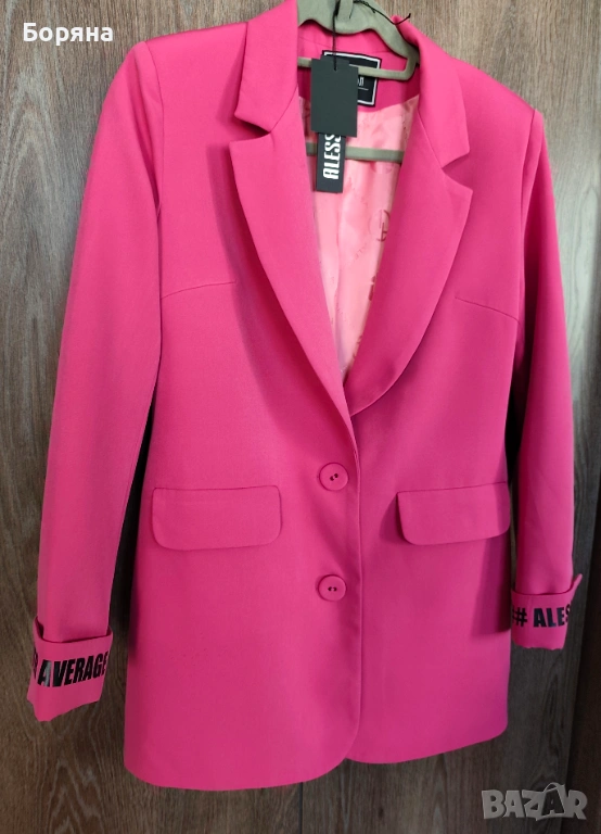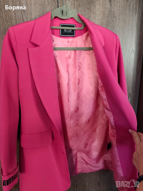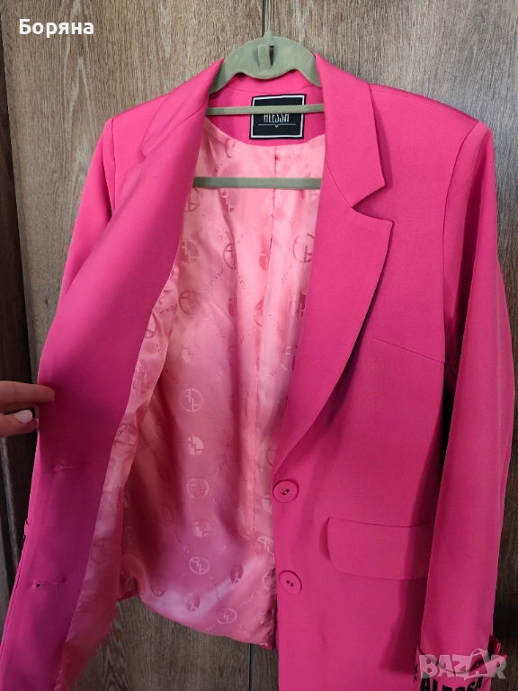 Разкошен блейзър на Alessa, един от най-красивите им модели - с надписи на маншета. В наситено цикламен цвят, със светло розова брандирана луксозна подплата.