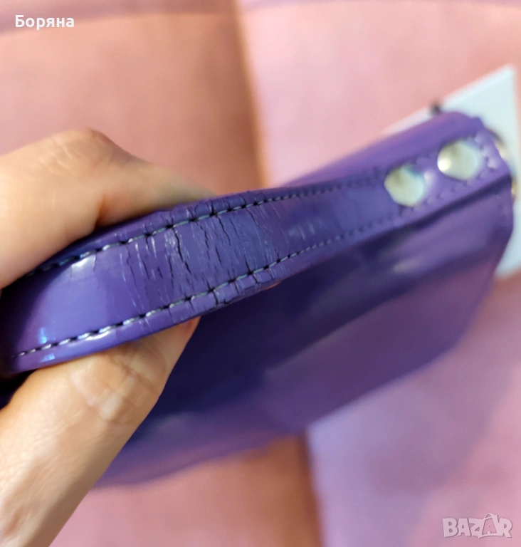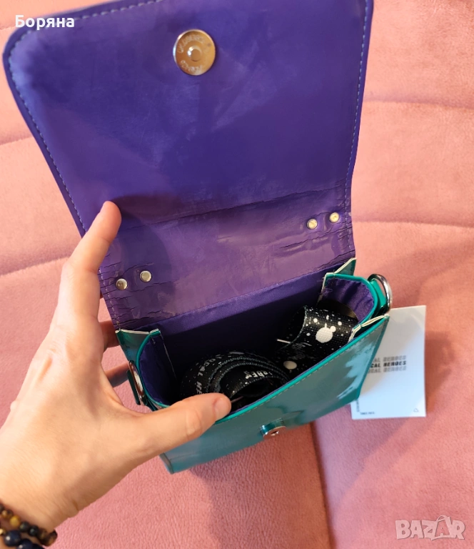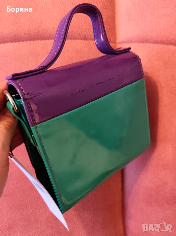 Local Heroes - малка чанта от твърд лак в лилаво и зелено, нова с етикет, с дефект по лака отзад и вътре на прегъвката. С къса и дължа дръжка.