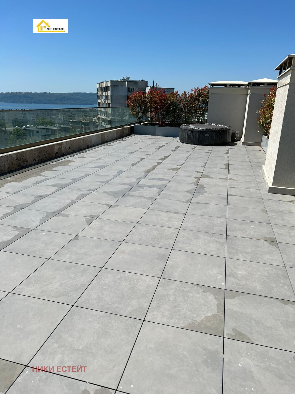 Голяма тераса от 300 кв.м от които 100 заградени като градина с мебели и джакузи.