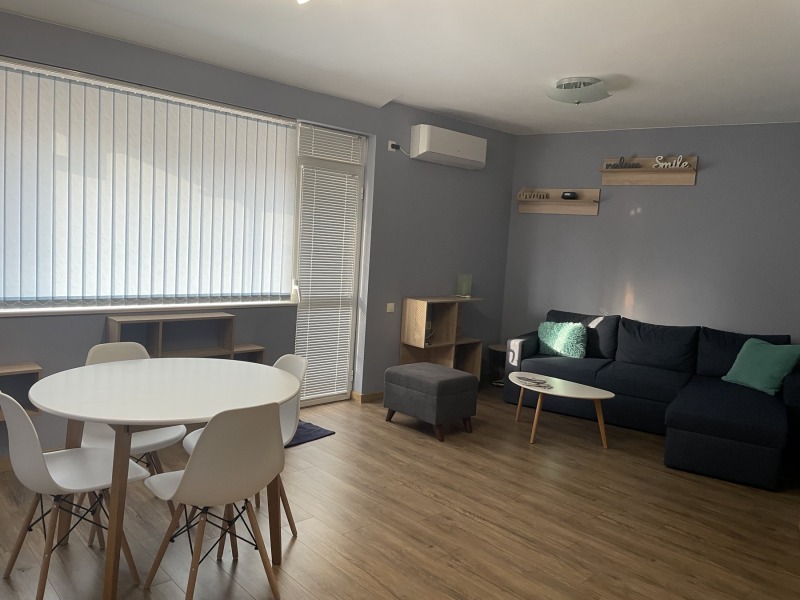 Агенция ТУИНС предлага ексклузивно под наем двустаен апартамент - 70кв.м., в нова сграда, кв. Кършияка, в непосредствена близост до Новотел Пловдив и пешеходния мост. Жилището се състои се от антре, просторен хол с трапезария и кухненски бокс, тераса, спалня, санитарен възел. Имотът е напълно обзаведен с нови мебели и ел. уреди, отопление - климатик.