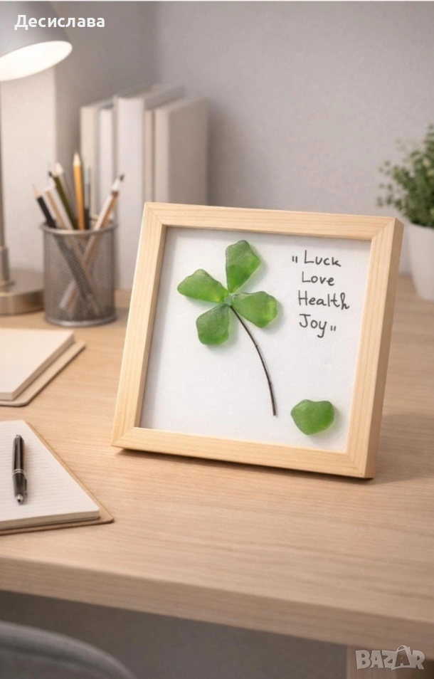 Внесете нотка късмет, позитивизъм и естествена красота в дома или офиса си 🌿 Тази ръчно изработена произведение на изкуството с четирилистна детелина е внимателно изработена от полупрозрачно зелено морско стъкло и е рамкирана в естествено светло дърво 15/15 см Всяка творба е уникална, изработена с любов и внимание към детайла, което я прави смислен декоративен акцент или ценен подарък. ✨ Символизъм на четирилистната детелина: Късмет Любов Здраве Радост
