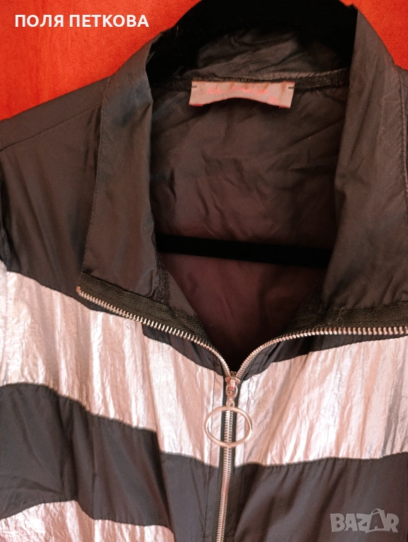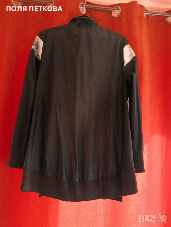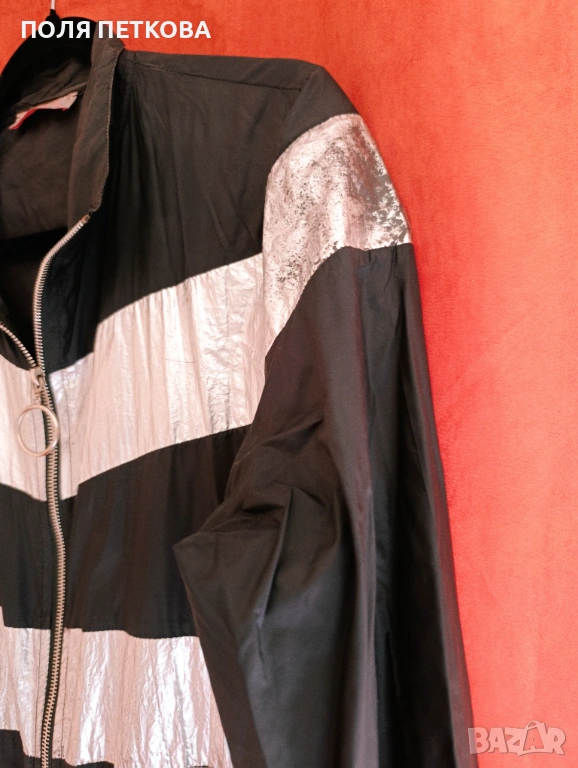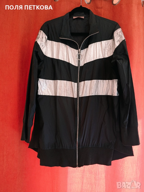Черно и сребро може да не се носи и като блуза ,туника и като връхно материя шушляк-текстил размер L гръдна 110 дължина 77 отзад 80 см много леко и удобно ефектен модел