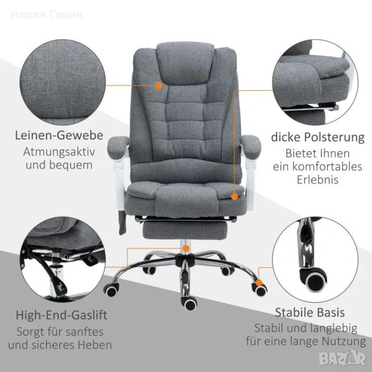 Накланяне на 135°: Просто се облегнете назад и изберете предпочитания от вас ъгъл. Свързаните подлакътници и прибиращата се поставка за крака спомагат за поддържане на отпусната стойка и намаляват натиска върху тялото.