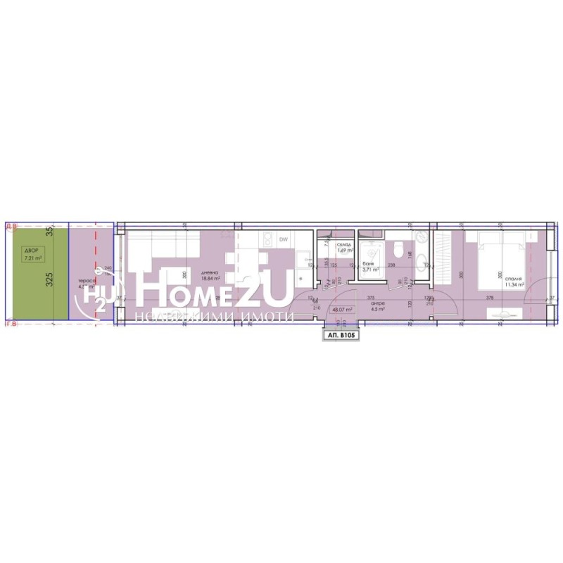 Продаваният апартамент е с обща площ от 56 кв.м. плюс 7.25кв.м. собствен двор, вход В, етаж 1.