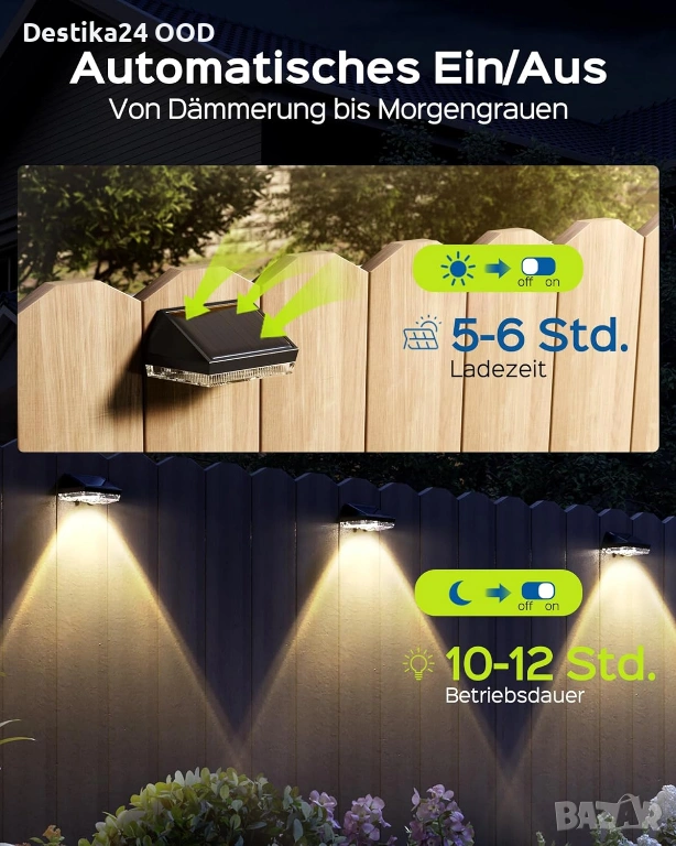 Соларни LED лампи за градина, двор, ограда, тераса или алея. Зареждат се автоматично през деня и се включват сами при здрач. Осигуряват ефектно декоративно и практично нощно осветление без нужда от ток или кабели.