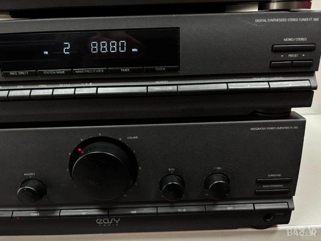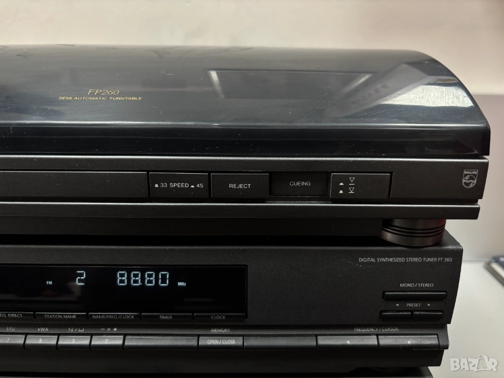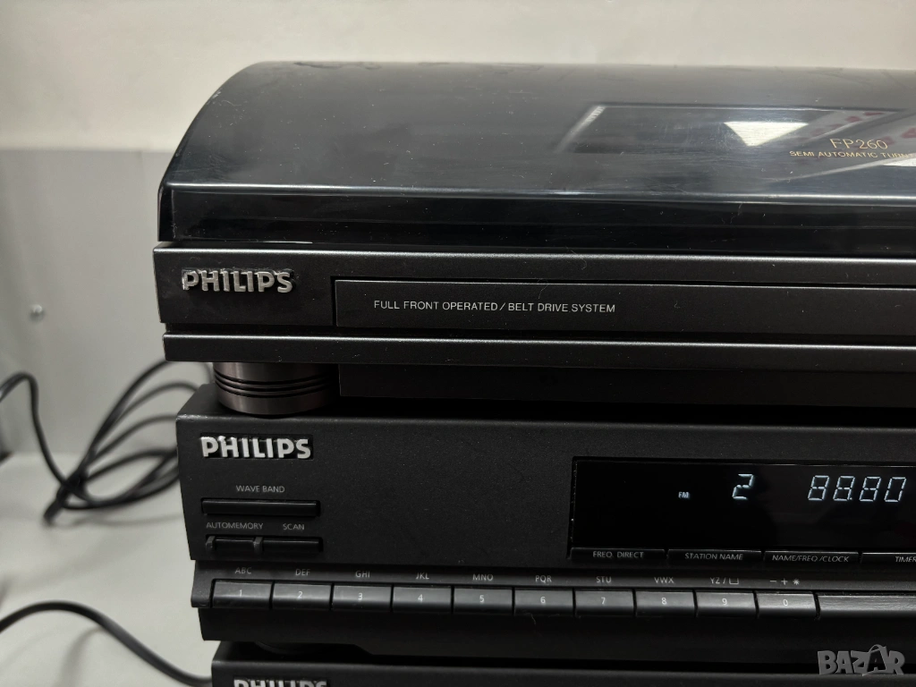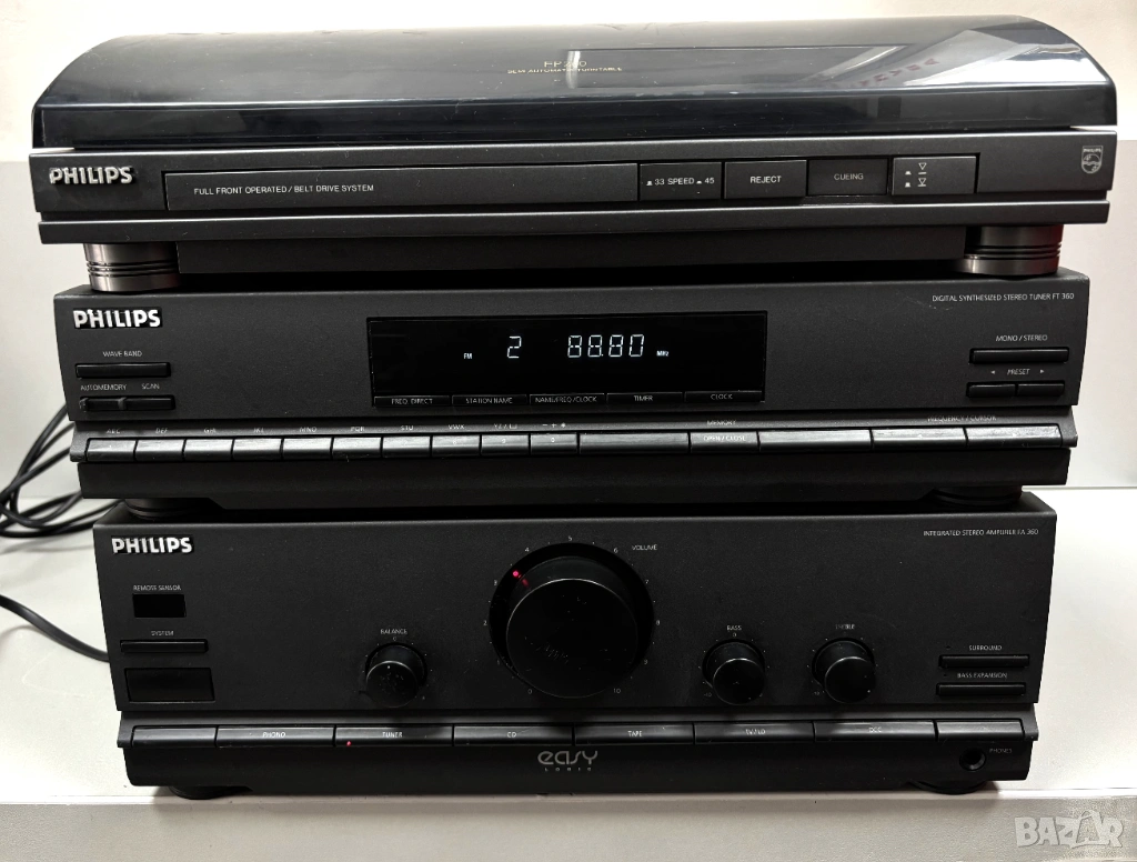 • Стерео тунер (в средата): Модел Philips FT 310 (или подобен от серията 300/360/380). Това е цифров синтезиран тунер с памет за станции, автоматично запаметяване и дисплей, показващ честотата или номера на станцията.