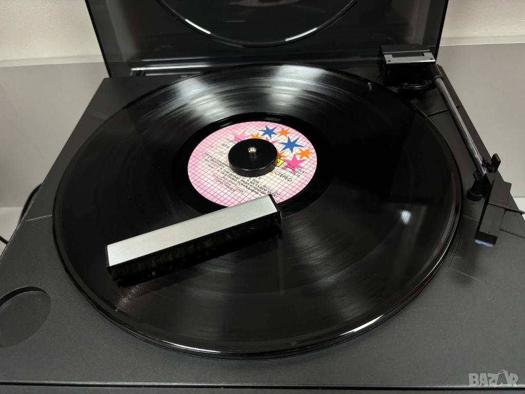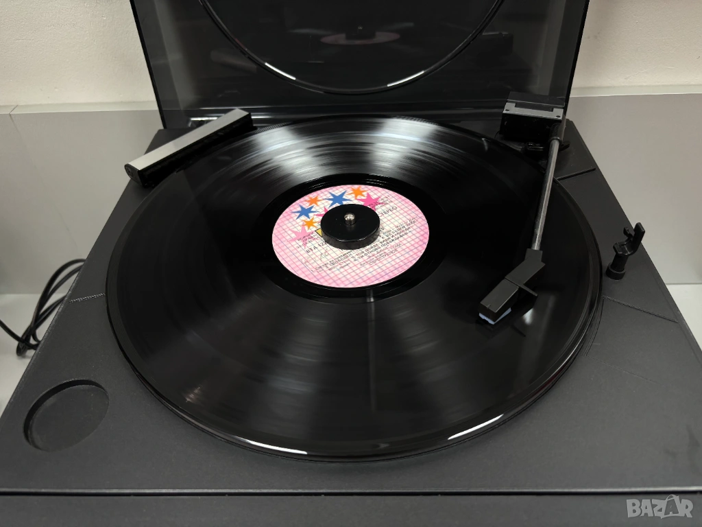 • Грамофон (най-отгоре): Модел с ремъчно задвижване (Belt Drive System), поддържащ скорости от 33 и 45 оборота в минута, с функции за автоматично връщане (Reject) и повдигане на рамото (Cueing).