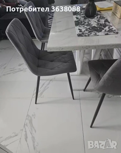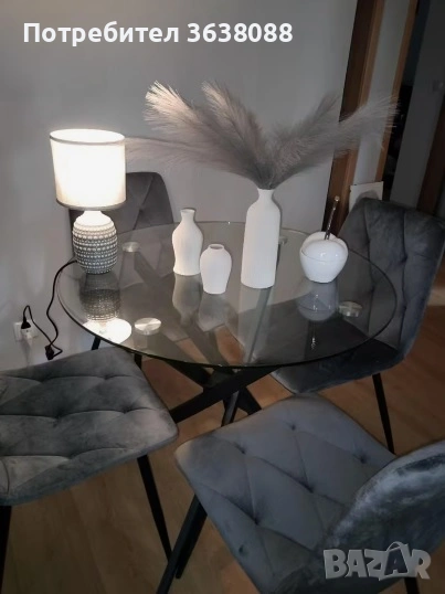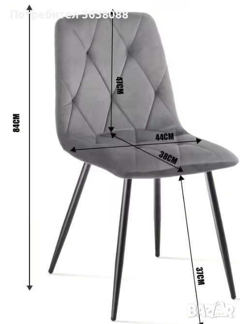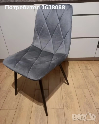 Четири нови нови трапезни стола в модерен стил със скандинавски нюанс. Тапицирани с кадифена тъкан, с подплатена облегалка и черни метални крака. Лесни за сглобяване. Подходящи за кухня или всекидневна.