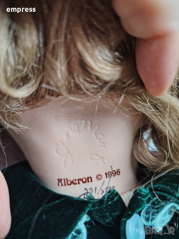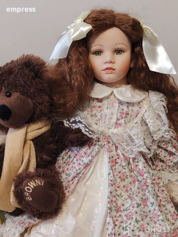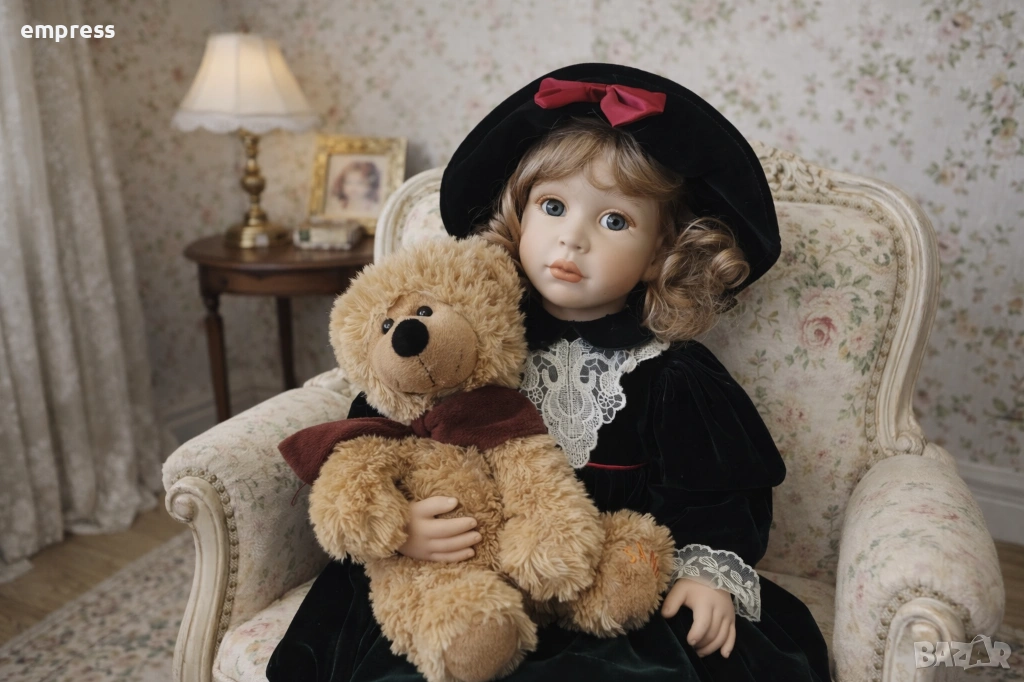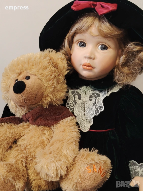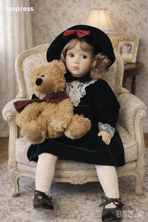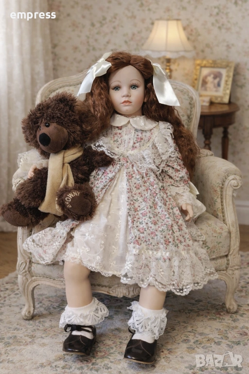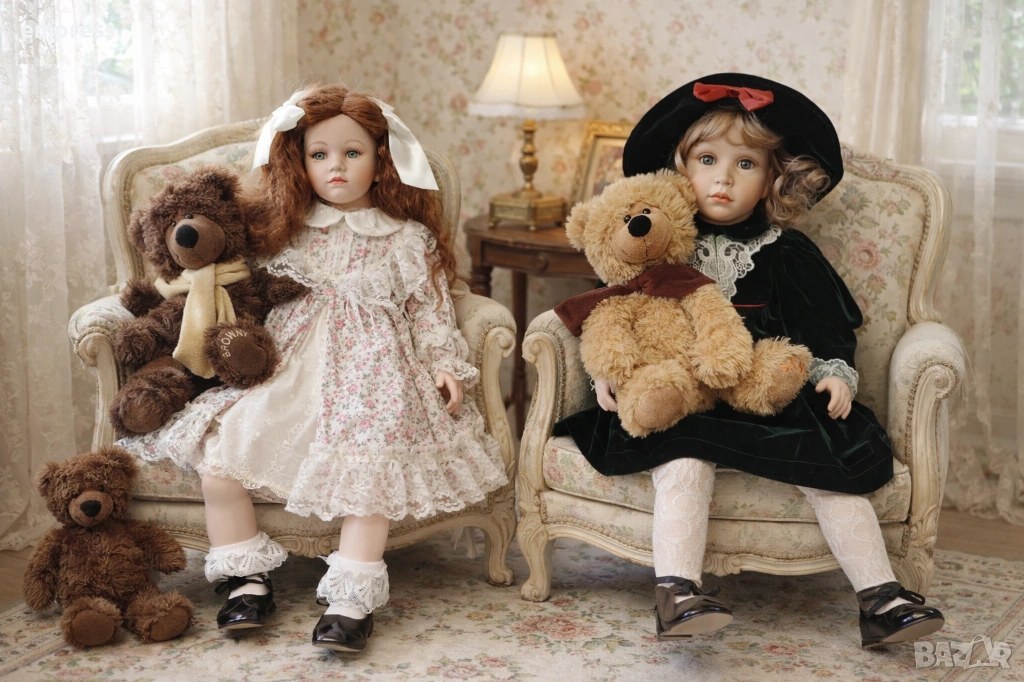 порцеланови кукли от английската компания Alberon Collection, всяка с височина 60 см. Тези кукли са истинско съкровище за колекционери и любители на винтидж естетиката. Всяка кукла е облечена изключително детайлно – първата носи нежна рокля с флорални мотиви и дантелени декорации, допълнена с бели чорапи с фина дантела и класически черни обувки. Втората кукла е с елегантна зелена кадифена рокля, красиво подчертана с дантелен яка и червена панделка на шапката. Чорапите й са деликатно ажурени, а обувките й са съобразени с традиционния викториански стил, като подчертават цялостната хармония на визията.