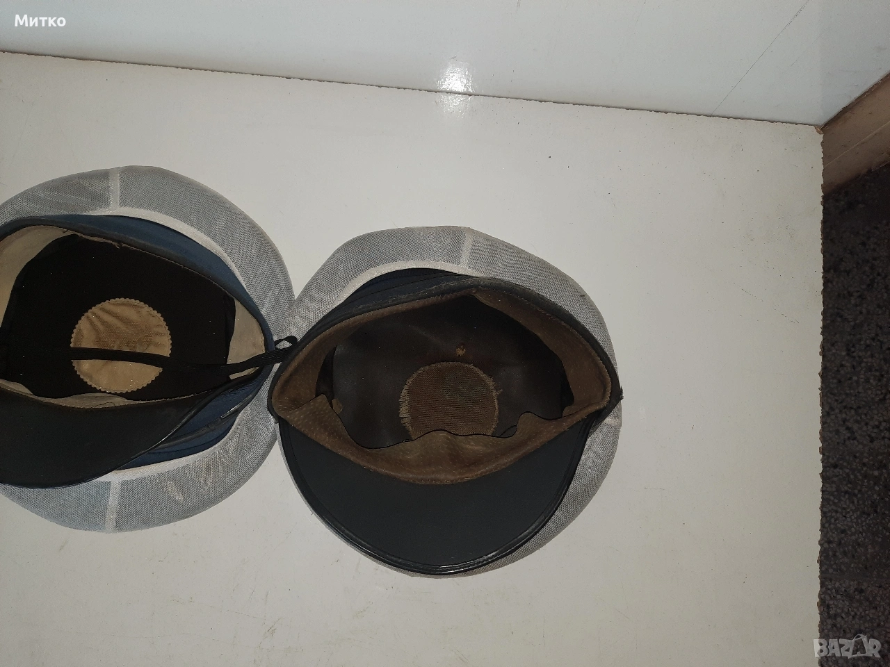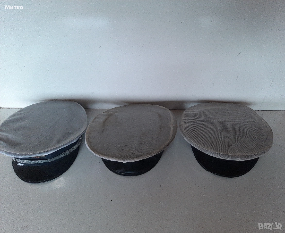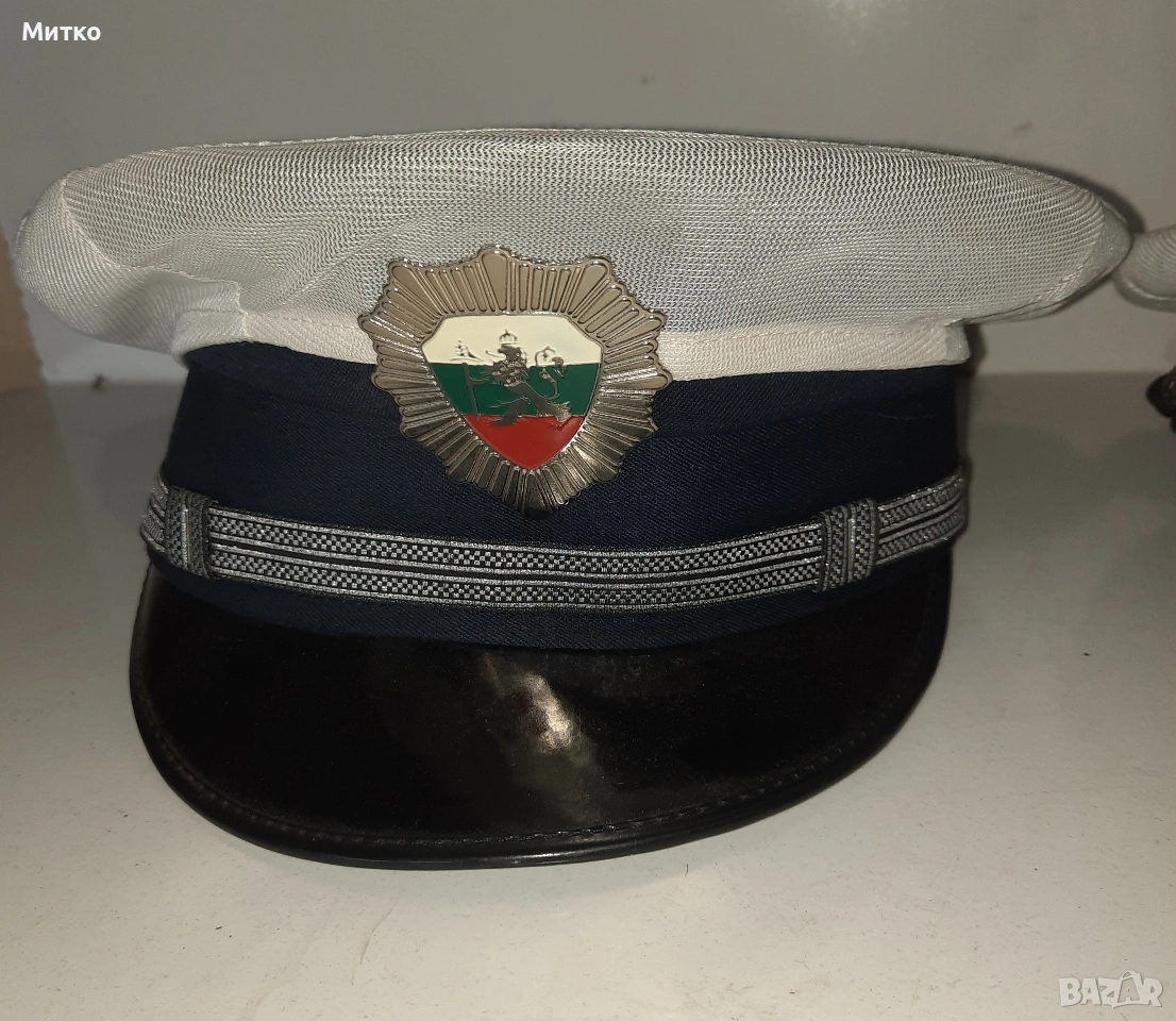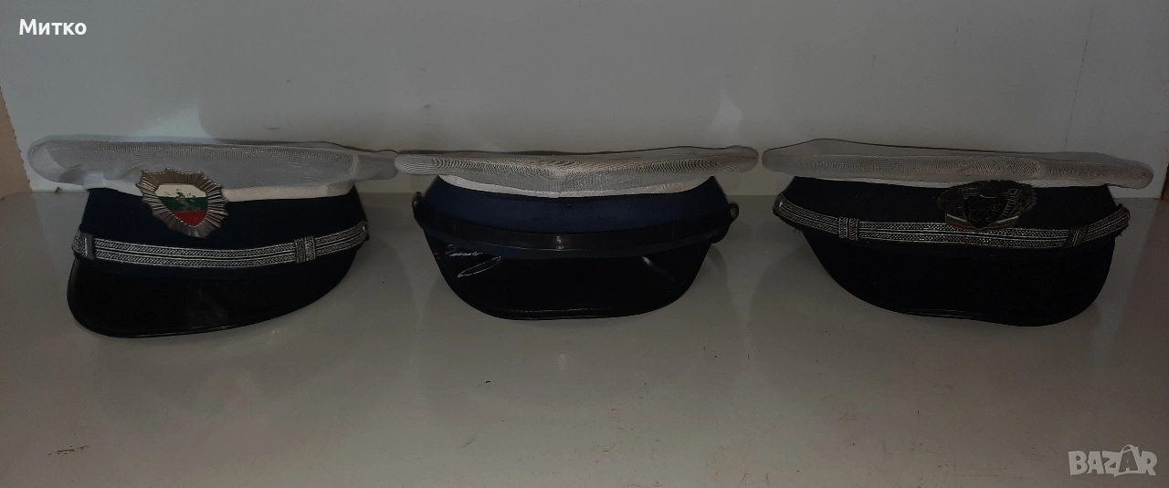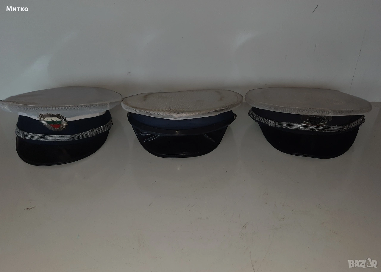 Стари полицейски фуражки с бели чохли на КАТ.Едната е без кокарда. Запазени са едната е като нова.Цена 4 евро за 1брой при покупка и на 3 те фуражки.