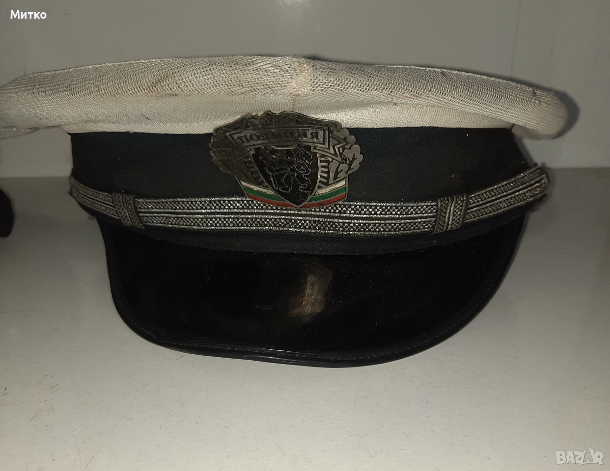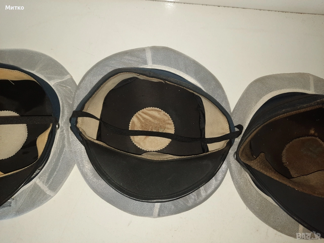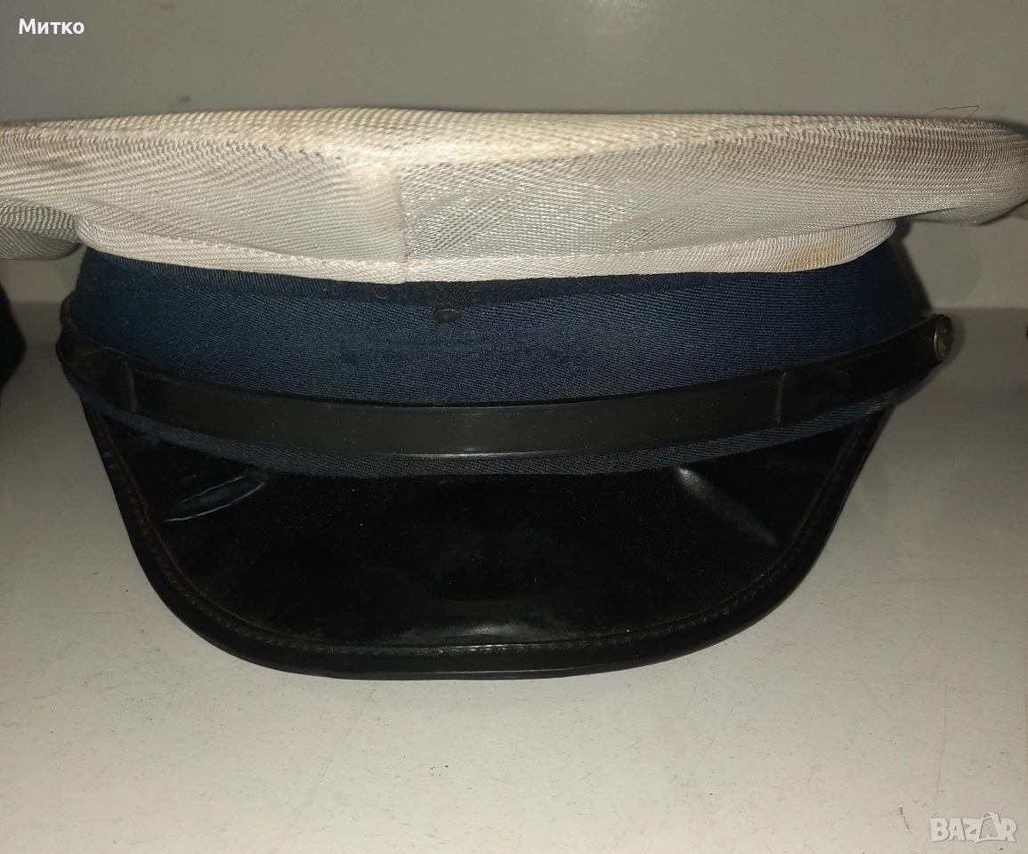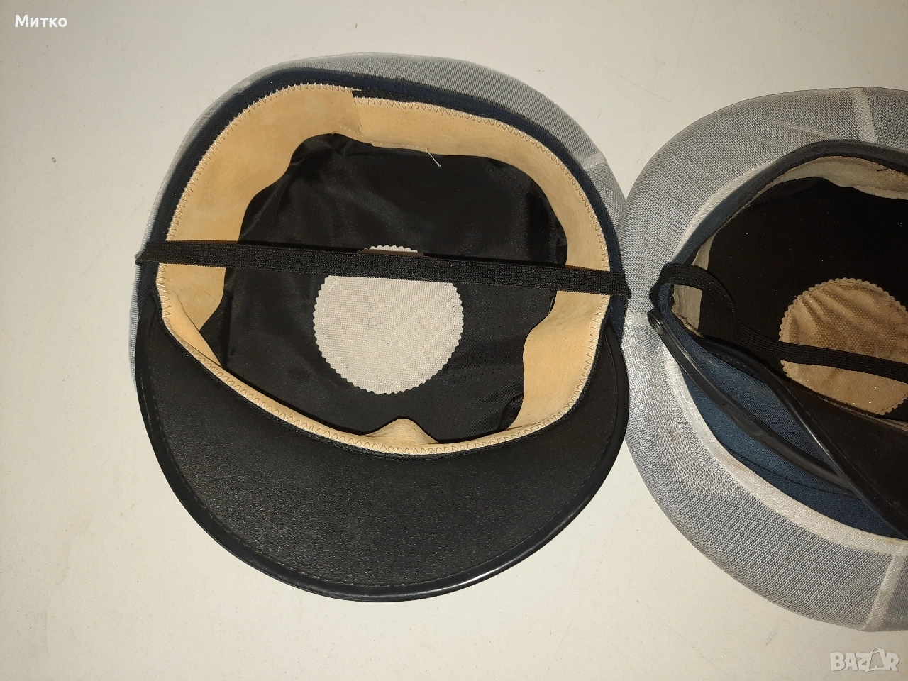 Стари полицейски фуражки с бели чохли на КАТ.Едната е без кокарда. Запазени са едната е като нова.Цена 4 евро за 1брой при покупка и на 3 те фуражки.
