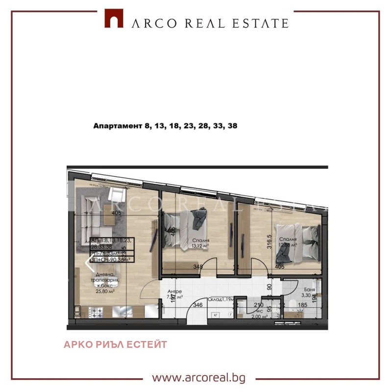 Разпределение: Входно антре, дневна с кухненски бос, 2 спални, баня с тоалетна, втора тоалетна,склад, 1 тераса.