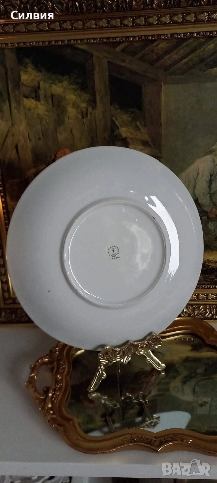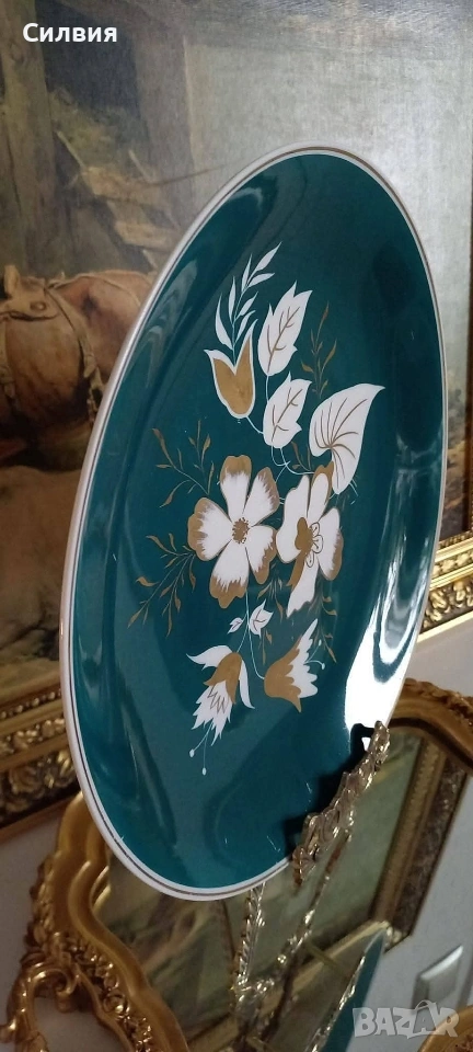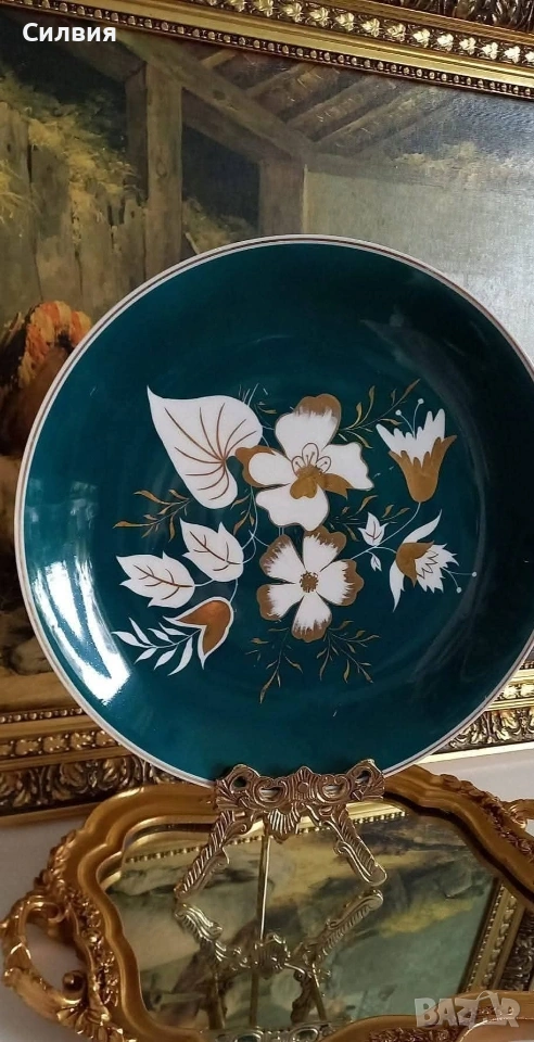 Луксозна Винтидж Чиния Lichte Porzellan (Германия) – Тюркоаз и Злато Изключително елегантна декоративна чиния от Lichte Porzellan от Германия. Идеална находка за колекционери на висококачествен немски порцелан. Производител: Lichte Porzellan (Германия, вероятно ГДР период). Средата/Втората половина на 20-ти век (Vintage). Дизайн: Наситен тюркоазен/изумруденозелен фон, декориран с богат флорален мотив в бяло и обилно златно покритие/позлата. Състояние: Отлично запазено, с гланцово покритие. ❗️С минимални драскотини... Размер: диаметър 27см. Цена 2️⃣5️⃣€ 48,90лв Чинията е чудесен акцент за декорация, витрина или колекция. •✽✧✽•°”˜🦋”°•✽✧✽•°”˜🦋”°•✽✧✽•°”˜🦋”°•✽✧✽•°”🦋˜”°•✽✧✽• Продава се само чинията (без златната стойка, показана за целите на снимките).