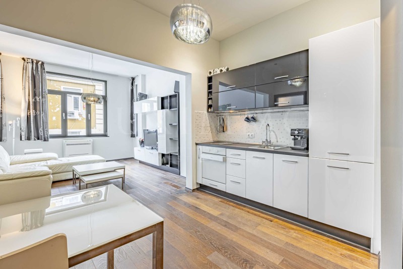 Жилището е с реална площ 86 кв.м, разположено е на 3-ти етаж от 4 в поддържана сграда без асансьор. Апартаментът е с високи тавани - 3 м, модерно и уютно обзаведен естествен паркет, светли стени, функционална кухня и комфортна дневна зона.