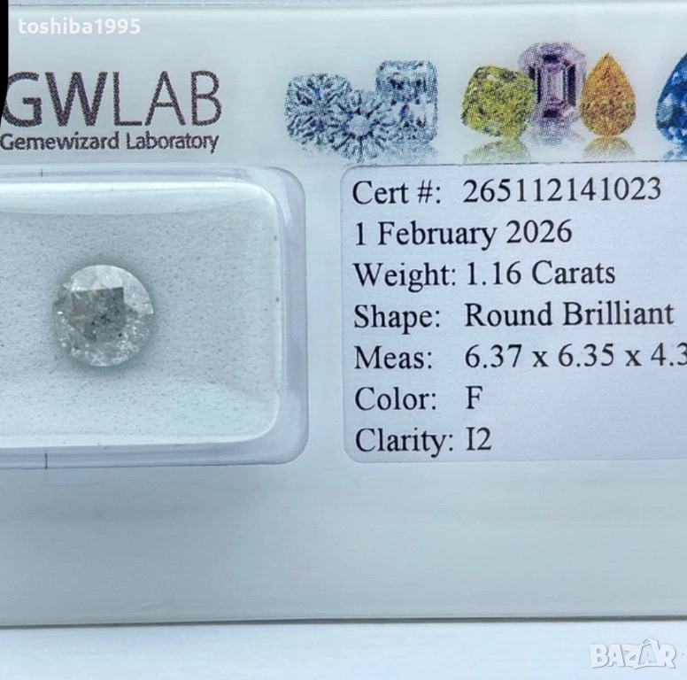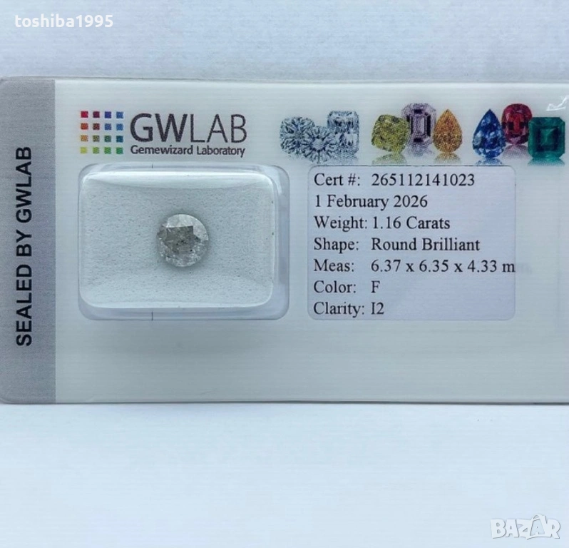 Продавам великолепен натурален диамант с впечатляващо тегло от 1.16 карата. Камъкът е с класическа кръгла форма (Round Brilliant), която осигурява максимален блясък и пречупване на светлината. Диамантът е запечатан в оригинален защитен блистер на престижната международна лаборатория GWLAB (Gemewizard Laboratory), което гарантира неговата автентичност и характеристики.