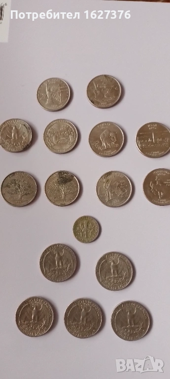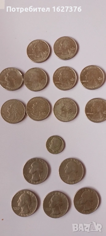 15 бр. монети от 25 цента. Има от 70те, 80те и по-нови + 10 цента (dime) от 1974 г.
