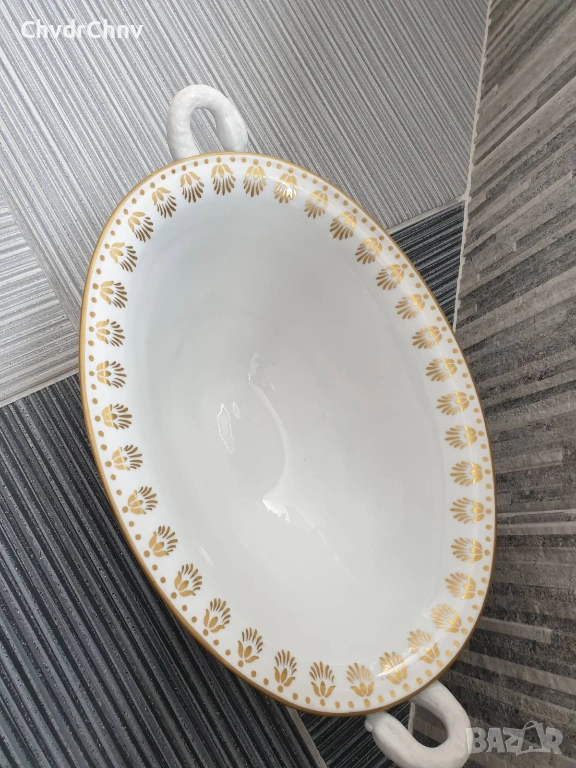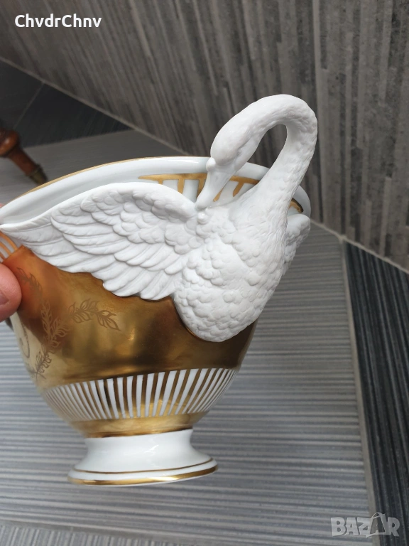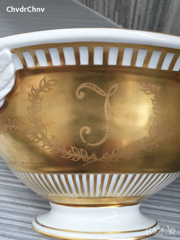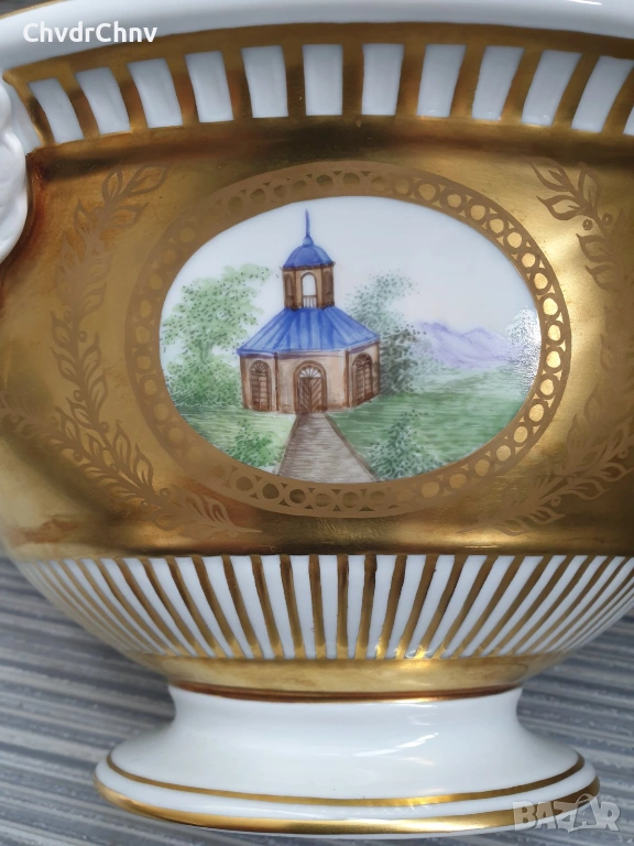 Изключително качествена изработка, богато декорирана с 22К злато, дръжките са от бисквитен порцелан (без глазура), с ръчно рисувана картина от едната страна, маркировка/печат отдолу (показана)