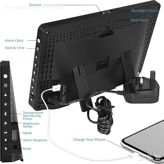 Устройството включва още дигитален календар, час (12/24-часов формат), алармен часовник и функция „snooze“. Бутонът за отлагане на алармата се намира в горната част над LCD дисплея. На гърба има USB порт за зареждане на телефон или таблет. Метеостанцията Kalawen може да се монтира на стена или да се постави на маса.