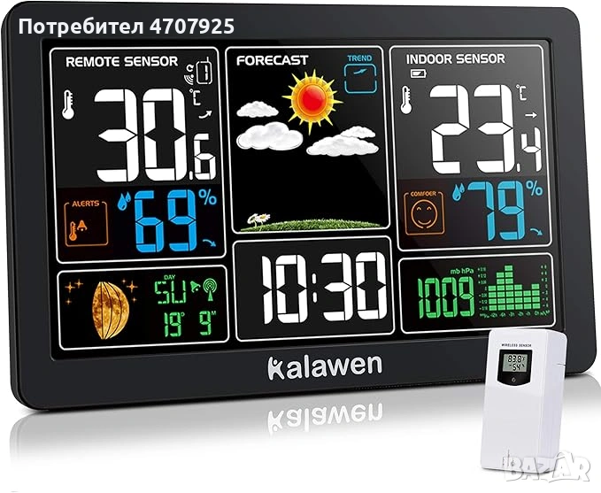 Комплектът метеостанция Kalawen включва голям цветен LCD дисплей (с вграден сензор) и безжичен дистанционен сензор. Домашната безжична метеостанция показва информация за времето в реално време чрез наблюдение на вътрешната и външната температура и влажност. 6 лесни и ясни икони (прогноза за следващите 24 часа): слънчево, леко облачно, дъждовно, проливен дъжд и снежно. Дистанционните сензори имат обхват на предаване до 60 м, което означава, че можете да ги поставите в задния двор или градината си.