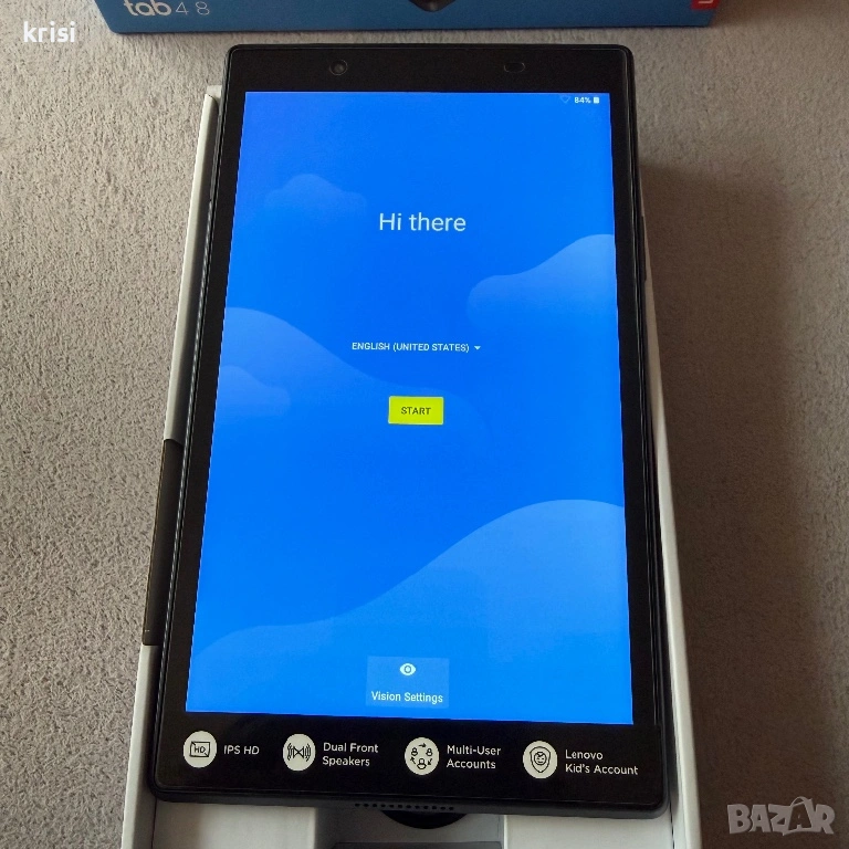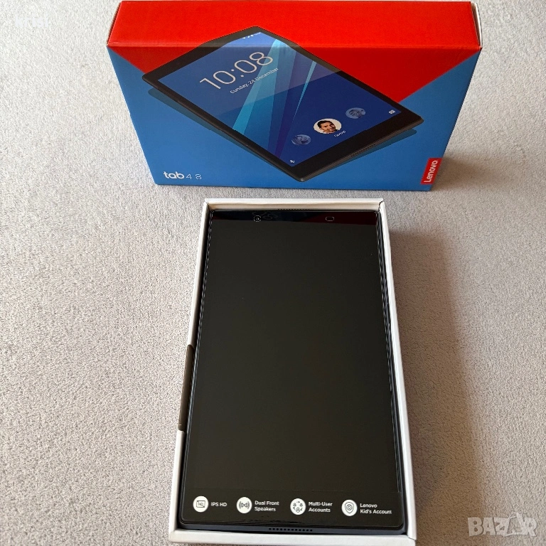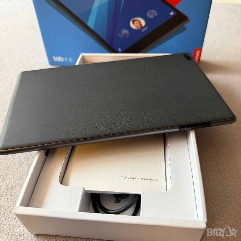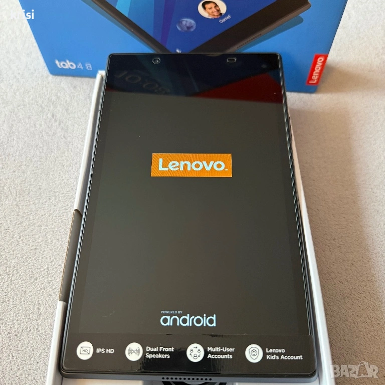 Таблета е със заводски стъклен протектор което означава че дисплея е без никакви дефекти също без следи от употреба и по корпуса пълен комплект оригинален кабел и адаптер за зареждане на Lenovo. Наличен слот за cd карта памет.